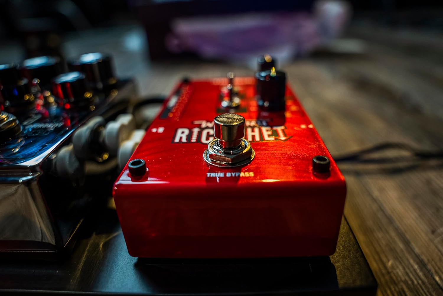 The Whammy Ricochet lets you bounce your playing up or down in pitch in controlled or crazy shifts. A momentary switch and customizable independent rise and fall time ballistics, allow you to get the Whammy action you know and love without the use of a treadle. Just hold your foot on the footswitch and let the Ricochet do the rest. Seven pitch selections - 2nd, 4th, 5th, 7th, Octave, Double Octave, and Octave+Dry, as well as a toggle to select up or down for the selected pitch. The Whammy Ricochet also has latching footswitch mode so you can rise or fall to pitch and stay there, and an LED ladder that shows your shift trajectory at all times. All these controls combine to create classic Whammy pitch-shifting as well as new sounds never heard before.