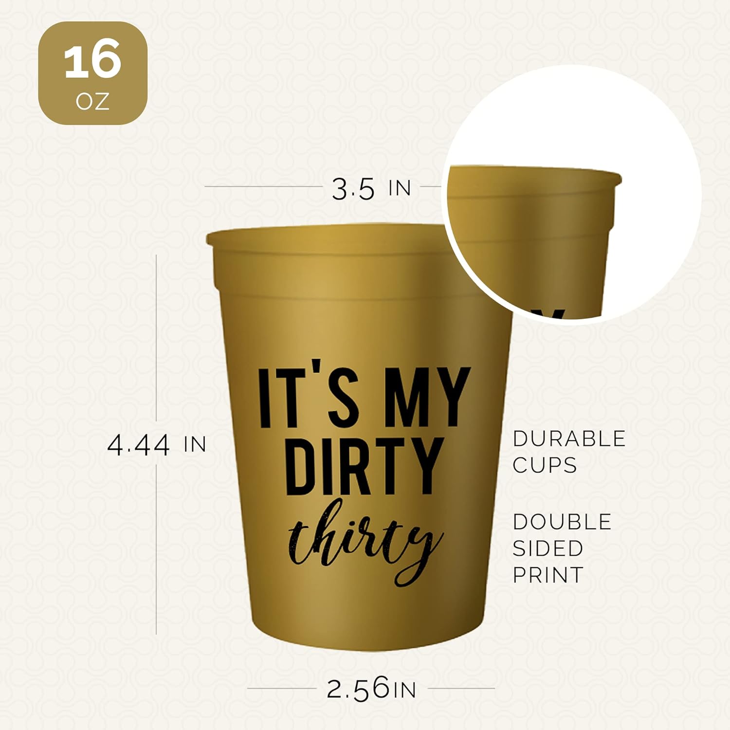 Celebrate the Big 3-0 with a Twist! Dive into your thirties with our "Dirty 30 Years" party set, a dazzling collection that promises to make your 30th birthday unforgettable. This set includes 12 can coolies and 1 special metallic gold stadium cup, each boasting the playful "It's My Dirty Thirty" slogan. Designed to bring a unique flair to your milestone celebration, these 16 oz cups and coolies are perfect for adding a personalized touch to your party. Each item in the set features a chic and contemporary design, combining elegance with a touch of whimsy. The standout metallic gold cup, reserved for the guest of honor, ensures you shine on your special day. Meanwhile, the accompanying can coolies offer a stylish way to keep drinks chilled and hands comfortable. Crafted with quality and convenience in mind, these can coolies and stadium cups are not only visually striking but also durable and reusable. They're ideal for any birthday bash, whether a laid-back gathering or a lively soirée. Easy to clean and store, they're perfect for both indoor and outdoor settings. Not just party accessories, these cups and coolies are keepsakes that your guests will cherish. As a fun reminder of the day, they're perfect for reliving the memories of stepping into a new decade in style. So, raise a cup to new beginnings and unforgettable moments with our "Dirty 30 Years" set. Here's to a birthday celebration that's as fabulous and memorable as you are!