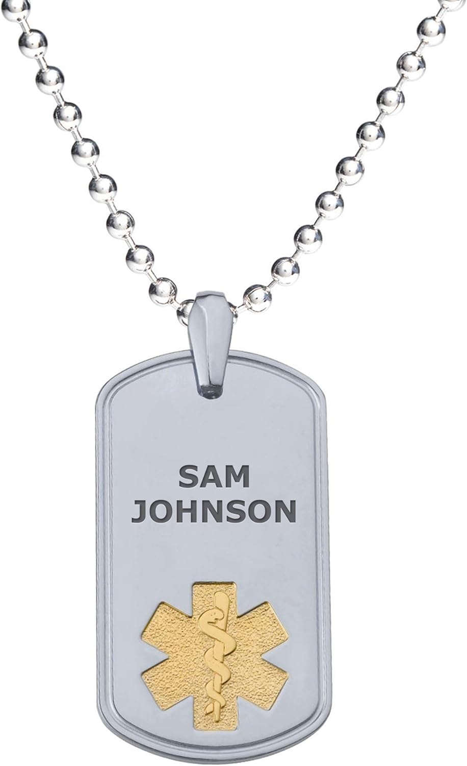 Divoti Deep Custom Laser Engraving Medical Alert ID Necklace for Men | Pure Titanium Deluxe Dog Tag Medical ID Necklace: The Divoti Pure Titanium Medical Alert Necklace offers unmatched peace of mind by ensuring critical health information is easily accessible during emergencies. Crafted from lightweight, durable, hypoallergenic titanium, this dog tag pendant provides long-lasting wear without irritating sensitive skin. Personalize the necklace with vital medical details such as allergies, chronic conditions, medications, or emergency contacts, helping medical professionals deliver precise care when every second counts. Its sleek, modern design makes it suitable for everyday wear without compromising style. Engineered for reliability, the pendant features precision German fiber laser engraving, creating deep, wear-resistant text in high-contrast black on PVD gold-plated titanium. The internationally recognized caduceus emblem is embossed and filled with color hard enamel for a professional, visually striking finish. The combination of hypoallergenic metal, waterproof construction, and robust craftsmanship ensures this medical alert necklace withstands daily wear, maintaining the clarity of your personalized information and providing lifelong protection and style. Each Divoti Medical Alert Necklace comes with a 24" or 28" stainless steel chain and secure lobster clasp, ensuring a comfortable and secure fit. The package also includes a durable PVC medical ID wallet card and access to private medical alert smartphone apps, allowing updates to your health information anytime. Made and engraved in the U.S., this necklace offers a complete emergency solution with fast processing, reliable construction, and practical accessories, combining style, safety, and convenience in one essential medical alert product. Simply “Add to Cart” to get your Order Today!