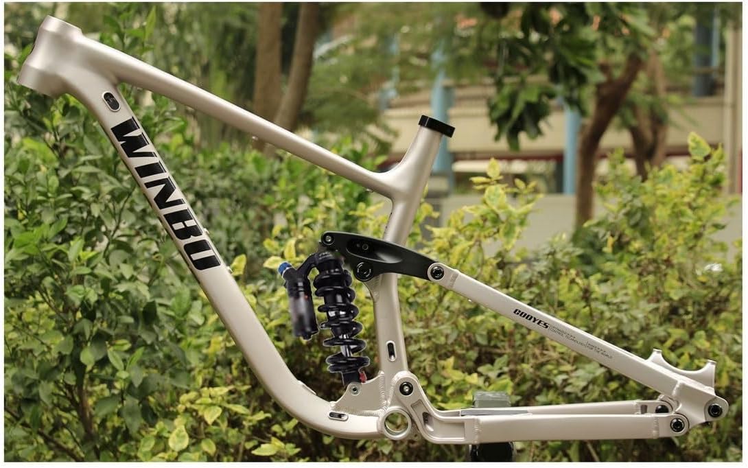 Downhill bike Suspension Frame 15.5''/17''/18'' 27.5/29er Mountain Bike Frame Boost Thru Axle Disc Brake Frame Travel 155mm With ShocksModel: mountain bike suspension frameMaterial: aluminum alloyRouting:Full internal routingFrame size:15.5''/17''/18''For wheels: compatible 27.5er/29er wheelsTravel:155mm TravelOil Spring Rear shock absorber : 210mm*550lbs, travel 54mm, weight 929g(32-22mm Bushing)Brake type: disc brakeHeadset: 44/55mm tapered headset(compatible with tapered/straight fork )Seat post: 30.9MM(Can be internal routing to raise lower the seat post)Thru axle:12*148mm boost(with 142mm conversion part)Tire: max for 27.5*2.7''/29*2.5'' tiresBottom bracket: 73mm threaded bottom bracket Weight: about 3.75kgPackage content: frame, headset (straight tube/taper tube fork universal) seatpost clamp/tail hook/thru axle lever/line snap.Note: Please check if the size of bike frame is correct before purchasing.Service:If you have any product and service problems, please contact us and we will reply with you within 24 hours.