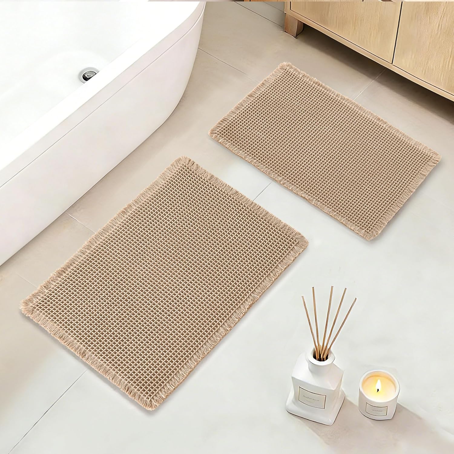 [Premium Waffle Texture] –2 Pieces Include, these woven pieces utilize advanced textile technology. The enhanced fiber density creates a substantial, tightly-woven surface that retains its structural integrity indefinitely. Offering both aesthetic charm and exceptional endurance, these mats RESIST COMPRESSION permanently. Measurement specification: Tassel trim included in overall size.