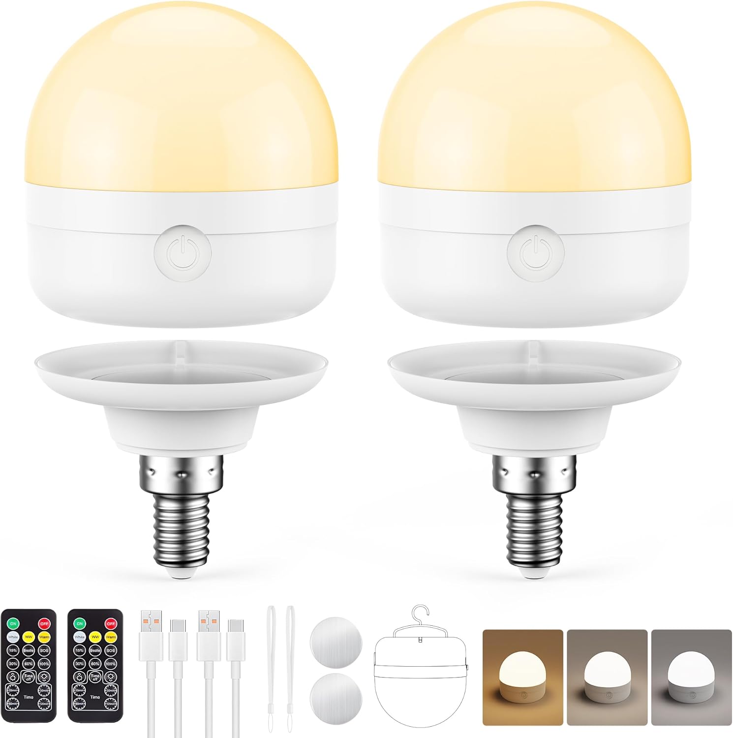 Light up any space—anytime, anywhere—with our E26 Rechargeable LED Light Bulbs. Designed for both everyday lighting and emergency backup, this portable LED bulb is powered by a 3500mAh rechargeable battery, delivering up to 8 hours at full brightness and 36 hours on low brightness after a full charge. Even during power outages, hurricanes, or outdoor adventures, your light never goes out. This upgraded 3-in-1 bulb offers flexible installation: 1.Stick it to any metal surface using the built-in magnetic base 2.Hang it anywhere with the removable hook 3.simply screw it into an E26 socket, just like a regular bulb. E26 is the standard medium screw base used in most homes, making it perfect for ceiling fixtures, pendant lights, table lamps, floor lamps, garages, basements, and outdoor wall lights. The included remote control lets you adjust brightness (15%–100%), set timers (15/30/60/120 min), switch between 3 color temperatures (white / warm white / warm), or activate SOS mode for emergencies—without leaving your seat. Whether for daily lighting, camping trips, storm preparation, or RV and off-grid use, this rechargeable light bulb is a must-have backup lighting solution for any household. Compact, portable, and easy to use—it brings reliable light wherever you need it most.