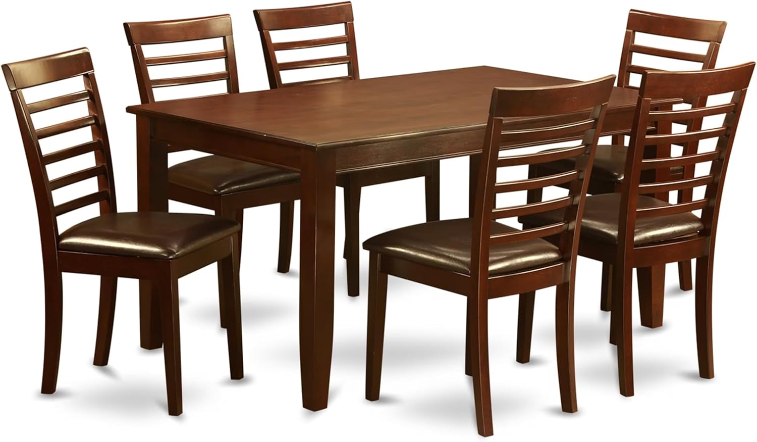 EAST WEST FURNITURE - DUML5-MAH-LC - 5-PC KITCHEN DINING SETThis 5-piece modern kitchen table set includes a dinner table and 4 Polyester Fabric seat mid-century dining chairs. It enhances the grace of your dining area with its modern design and beautiful wooden legs. The set is coated with high-quality mahogany color, offering a traditional look and ensuring durability. It is well-known for its design and is suitable for modern homes. You'll love having this beautiful dining table set at home, as it can be used in both dining rooms and kitchens. The versatile rectangular table is perfect for dining, while the chairs feature a high ladder back, Polyester Fabric seats, and wooden legs. These chairs are specifically designed to be easily maintained and suitable for everyday use. The chairs can be conveniently tucked under the table after meals to save space. They provide a comfortable dining experience for family gatherings, parties, and more, adding magnificence to your dining room. Assembly is easy, and we prioritize customer satisfaction, so you can confidently purchase our products.PRODUCT FEATURES:Frame Material: Asian HardwoodFrame Color: MahoganyChair Seat: Polyester FabricChair Back: LadderChairs Dimensions: Length: 22; Width: 17; Height: 38.Table Measurements: Length: 60; Width: 36; Height: 30.Included: A Modern Kitchen Table and 4 Wooden Dining Chairs.