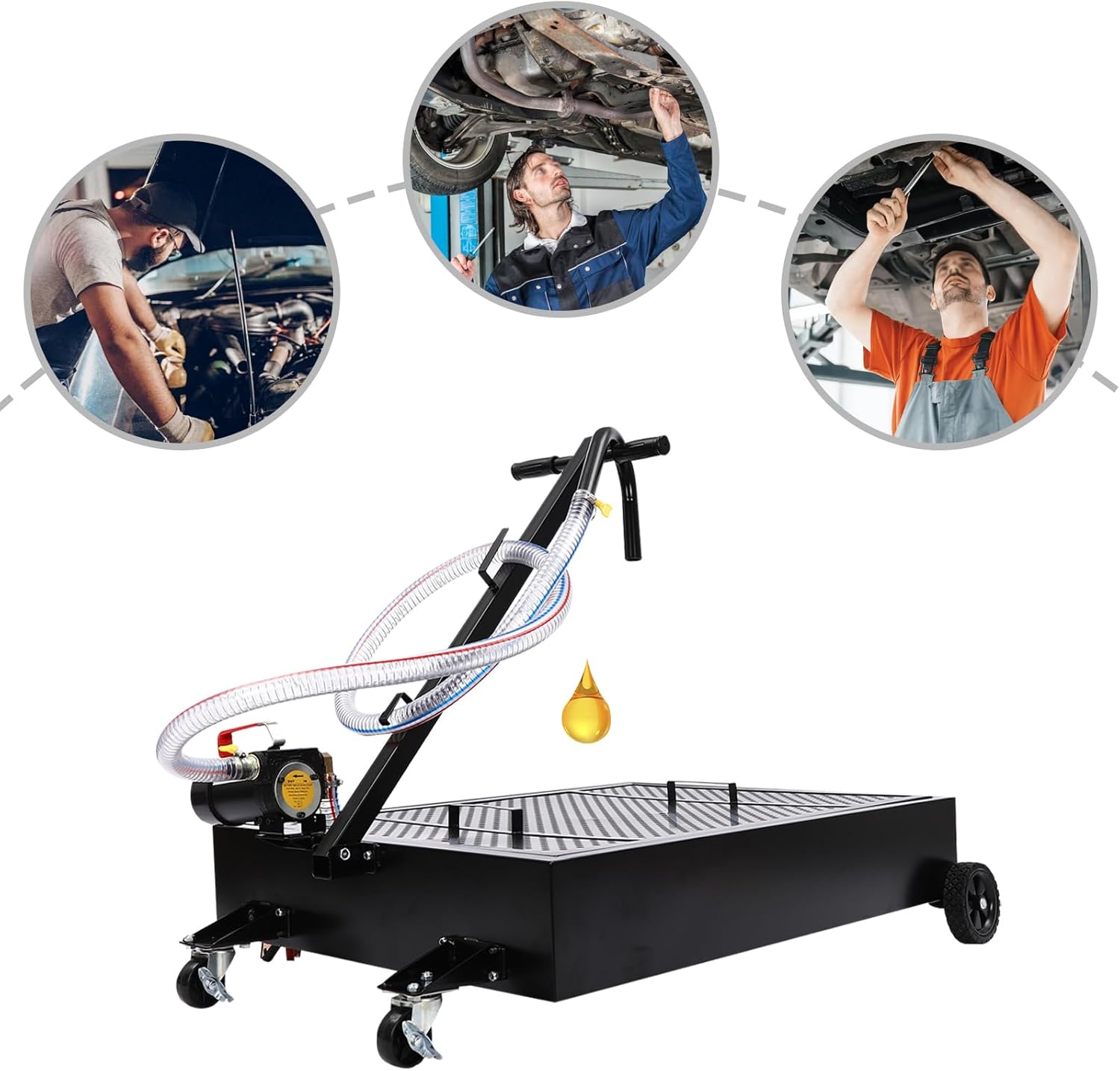 DescriptionThis large-capacity oil drain pan with a pump is designed for easily and quickly collecting and draining waste fluids. It is characterized by high-quality materials, a powerful pump, large capacity, good stability, and effortless movement, greatly improving your working efficiency and saving labor. It is ideal for frequent use in the garage or workshop.Key FeaturesFirm Installation: The pre-drilled holes, complete accessories, equipped clamps, etc. help you assemble the product firmly with less effort.Foldable T-handle: The anti-slip T-handle is easy to grasp and allows you to easily push this product, while its foldable design makes it convenient to place the hose under the vehicle.Customer Service: We aim to provide quality products and services. If you have any problems, please feel free to contact us. We will reply and solve the problem for you as soon as possible.DetailsLarge Wheels: Their large size and non-slip patterns give this product great mobility, allowing it to move smoothly over a variety of surfaces.Mesh Cover: The high-quality mesh cover with evenly distributed small holes and two handles can prevent debris and other parts from falling into the oil while ensuring convenient installation or moving.ApplicationIt is designed for use with heavy-duty trucks, buses, cars, SUVs, RVs, and other vehicles. It can be used to collect waste fluids, including motor oil, transmission fluid, and coolant.SpecificationsColor: BlackMaterial: SteelProcess: Electrostatic SprayingAssembly Required: YesCapacity: 56.78L/15GalPump Rated Voltage: 12VPump Rated Current: 13APump Rated Power: 155WPump No-load Speed: 4500r/minPump Speed Range: 3500r/minPump Flow Rate: 40L/min/10.57gal/minHead: 10m/32.8ftAbsorbing Distance: 5m/16.4ftHandle Rotatable Angle: 0-145°Hole Diameter: 10mm/0.39inchSoft Pipe Length: 2.5m/8.2ftPower Cord Length: 1.5m/4.92ft Tank Size: 78.1*50*17.61cm/30.75*19.69*6.93inchHandle Size: 75*3cm/29.53*1.18inchWheel Size: 12.35cm/4.86in, 6.35cm/2.5inchPackaging Size: 87*56.5*23.5cm/34.25*22.24*9.25inGross Weight: 19.95kg/43.98lbsNet Weight: 18.95kg/41.78lbsPackage Included1*Oil Drain Pan1*Electric Oil Pump2*Large Wheels2*Universal Casters1*8.2ft Soft Pipe1*English ManualOther Needed Accessories Notes1.Please check the size carefully before ordering.2.Please read the operating manual and product label carefully before use.3.Please allow the slight color difference caused by the shooting light and 1-3cm error due to manual measurement, and make sure you do not mind before you order.