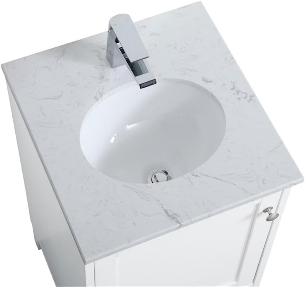 While unassuming, this 18" vanity in a white finish sure knows how to redefine luxury. The sleek brushed nickel knobs adorn the single cabinet door and base drawer which allows you to store your bathroom toiletries and necessities. Standing strong on oblique legs and dressed with a Calacatta quartz countertop, this vanity will surely create beauty and casual elegance in your bathroom or powder room.Features:- Finish: White- Material: MDF, Quartz, Porcelain, and Metal- Hardware Finish: Brushed Nickel- Hardware Material: Steel- Shape: Rectangle- Wood Type: Rubberwood- Vanity Base Finish: White- Vanity Base Material: MDF- Vanity Countertop Finish: Calacatta Quartz- Vanity Countertop Material: Quartz- Vanity Countertop Edge Style: Flat- Vanity Sink Material: Porcelain- Free-standing vanity with undermount sink- Faucet Type: Single (Not Included)- Number of Faucets: 1- Drawer Interior Finish: Wood Grain- Drawer Handle Design: Knobs- Shelf Material: MDF- Number of Cabinets: 1- Leg Design: Oblique- Room of Use: Bathroom- Joinery Type: Square Ended Butt Joint- Undermount porcelain sink is included- Convenient access for plumbing installation with cut out back panel- Free standing, no assembly required- TSCA VI Certification- Drain assembly not included- Finished back- Metal drawer railing with knob handles- Full extension, ball bearing, soft close metal drawer glidesSpecifications:- Product Dimensions: 34" H x 19" W x 18" D- Product Weight: 72.3 lbs- Drawer Dimensions: 4.5" H x 14.88" W x 13.75" D- Drawer Dimensions: (Interior) 4.5" H x 14.88" W x 13.75" D- Product Dimensions: (Cabinet) 19.75" H x 15.88" W x 17.63" D- Product Dimensions: (Door Thickness) 0.7"- Top Dimensions: 0.7" H x 18" W x 19" D- Product Weight: (Countertop) 23.3 lbs- Product Dimensions: (Sink) 8.25" H x 11.75" W x 9.5" D- Product Dimensions: (Sink Drain Hole) 1.75"- Product Dimensions: (Vanity Faucet Hole) 1.38''"- Product Dimensions: (Vanity Faucet Hole Distance from Countertop Top Edge) 3"- Product Dimensions: (Vanity Faucet Hole Distance from Countertop Side Edge) 9"- Product Dimensions: (Sink Drain from Countertop Side Edge) 9"- Number of Doors: 1- Number of Drawers: 1- Number of Shelves: 1- Warranty: 1 Year