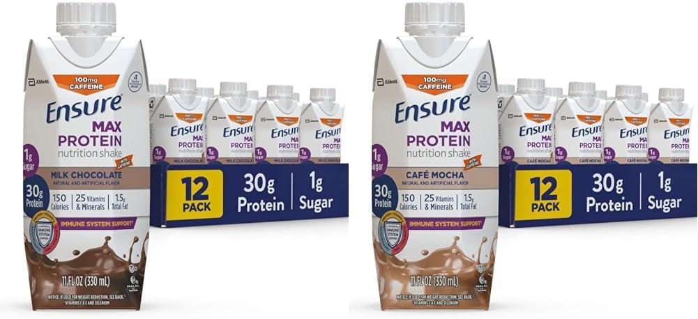 Ensure Max High Protein Nutrition Shake Milk with 30g of Protein 1g of Sugar , Chocolate w/ Caffeine, 11 Fl Oz (Pack of 12)Ensure Max Protein nutrition shakes provide targeted nutrition to help you stay healthy, active, and energetic. Each delicious ready-to-drink shake has 30g of high-quality protein to help keep muscles strong and satisfy hunger. Ensure Max Protein also has 150 nutritious calories, plus 25 essential vitamins and minerals, including vitamins A and D, zinc, and antioxidants (vitamins C and E) to support immune health. From Ensure, the #1 doctor-recommended brand.† Enjoy our new flavors, Creamy Strawberry and Milk Chocolate with Caffeine—with 100mg of caffeine, as much as a cup of coffee.* This product is gluten-free and suitable for lactose intolerance.‡ * 8 fl oz (1 cup) of coffee = 100 mg caffeine. † Among doctors who recommend liquid nutritional products to their patients. ‡ Not for people with galactosemia. § In select stores. The SNAP (Supplemental Nutrition Assistance Program) name is a service mark of the US Department of Agriculture. USDA does not endorse any goods, services, or enterprises.Ensure Max Protein Nutrition Shake with 30g of Protein, 1g of Sugar, High Protein Shake, French Vanilla, Liquid, 11 fl oz (Pack of 12)Ensure Max Protein nutrition shakes provide targeted nutrition to help you stay healthy, active, and energetic. Each delicious ready-to-drink shake has 30g of high-quality protein to help keep muscles strong and satisfy hunger. Ensure Max Protein also has 150 nutritious calories, plus 25 essential vitamins and minerals, including vitamins A and D, zinc, and antioxidants (vitamins C and E) to support immune health. From Ensure, the #1 doctor-recommended brand. Enjoy our new flavors Creamy Peach & Cherry Cheesecake. This product is gluten-free and suitable for lactose intolerance. Among doctors who recommend liquid nutritional products to their patients. Not for people with galactosemia. In select stores. The SNAP (Supplemental Nutrition Assistance Program) name is a service mark of the US Department of Agriculture. USDA does not endorse any goods, services, or enterprises.