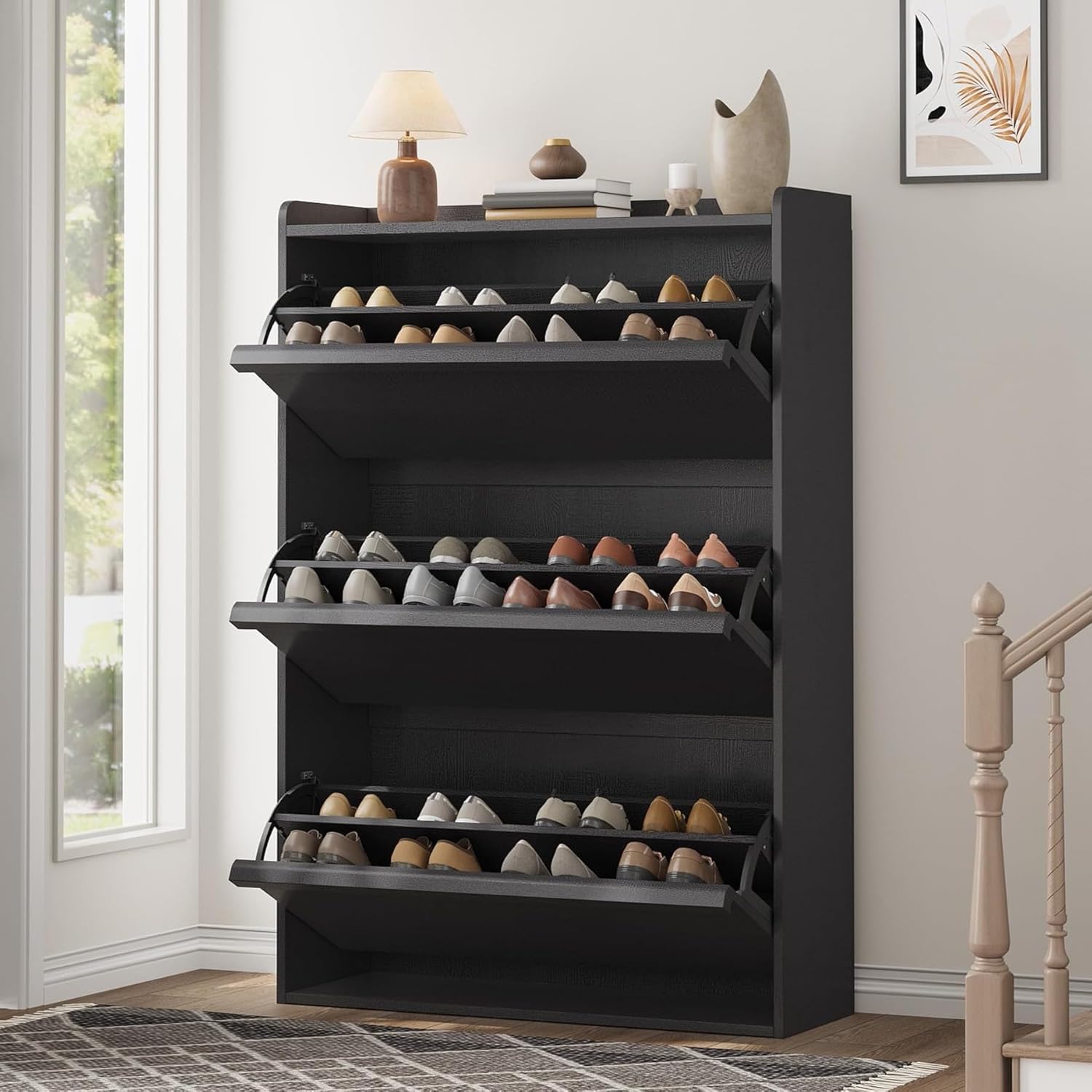 Upgrade Your Entryway with a Modern Shoe CabinetTired of cluttered entryways and scattered shoes? Discover our versatile wooden shoe cabinet, expertly designed for entryways, hallways, and living rooms. With a sleek, space-saving profile, this freestanding shoe organizer fits perfectly in narrow spaces—great for apartments, mudrooms, or busy households.Adjustable Shelves: Easily customize compartments to fit sneakers, heels, boots, or children’s shoes, making this cabinet perfect for families of all sizes.Durable & Stylish: Crafted from high-quality engineered wood (MDF), this cabinet boasts a sturdy build and a modern white or grey finish that blends effortlessly with any home decor.Safe & Stable: Features an anti-tip device for wall mounting, ensuring security in homes with kids or pets. The waterproof top holds up to 25 lbs for keys, bags, or decor.Multi-Functional Storage SolutionBeyond shoes, use this cabinet to store blankets, books, or accessories—making it a smart choice for maximizing any home’s organization.Product Highlights:Space-saving narrow profile for entryways, hallways, or closetsSturdy MDF construction with elegant wooden handlesModern, clean finish available in white, grey, black and oakVentilated design to reduce odors and keep shoes freshTransform your home with this hidden shoe rack—the perfect blend of style, function, and convenience. Say goodbye to entryway clutter and hello to a neat, welcoming space every day.