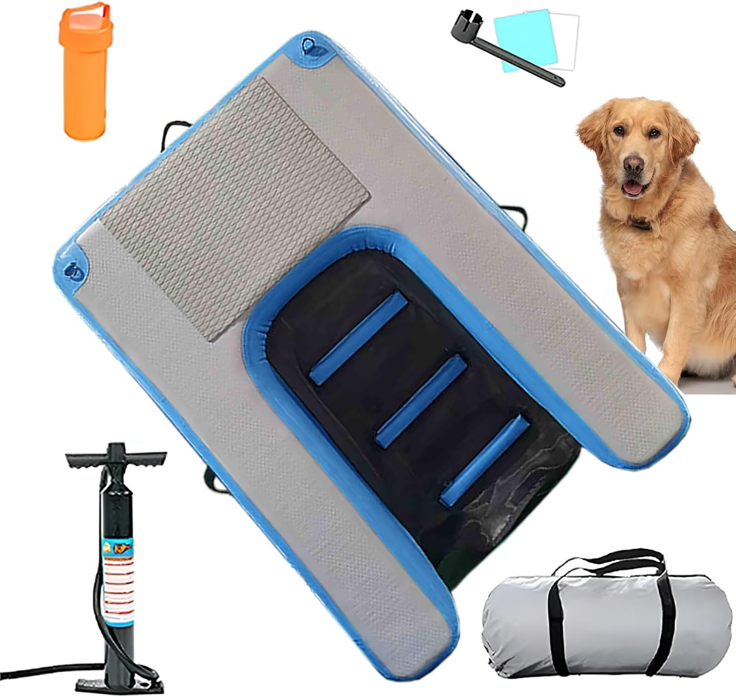 Engineered with the durable materials, this dog ladder is designed to endure and accommodate even the largest of dogsThis floating dog ramp allows your dog to get in and out of a boat, dock, or pool with ease.Versatile and adaptable to various water activities, it's perfect for poolside lounging, pontoon boat adventures, or dockside playExperience the joy of safe and easy water access for you and your dog, with the added convenience of having everything readily available whenever you need itMaterial: Polyvinyl Chloride (PVC)Color: Cyan , Blue , Gray , Red , YellowSize: L 150 cm/59'', W 100 cm/39.4'', H 10 cm/3.9''Product Weight: 8 kg/17.6 IbLoad Capacity: 104 kg/230 PoundsPackage Content: 1 x dog boat ramp1 x handy carry bag, 4 x ropes1 x hand pump1 x repair kitFeature:The dog ramp is made of anti-leakage material to ensure stability and prevent rollingThe dog ramp surface has a concave convex texture design and an additional EVA anti-slip pad to provide good gripFast Inflation Set up in minutesStorage-Friendly Easily packs awayBuilt-in steps add increased traction underwaterTips:Manual measurement products may have dimensions of a few centimeters of difference, please understandThere may be some differences between the image and the product due to display and lighting reasons, please refer to the actual product