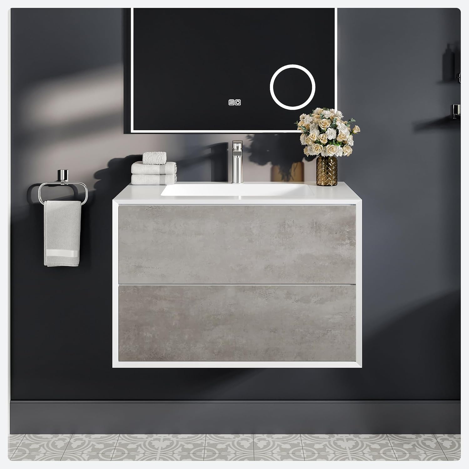 The Eviva Vienna vanity makes a bold statement with its modern look. The exclusion of hardware allows the countertop to blend well with the cabinet basin giving it a classy yet minimalist look. Wall mount installation keeps the Vienna suspended above your floor, leaving plenty of room to place bins or baskets that complement the vanity's minimalist style. Available in a single or double sink version in many colors and in sizes 36 and 75 inches.