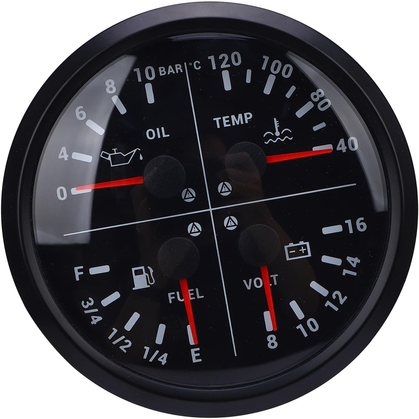 1. Accurate Display: The multifunctional gauge features E 1/4 1/2 3/4 level, 0 to 10bar oil pressure, 40 to 120℃ water temperature, 8 to 16V voltage. 2. Multifunctional Use: The digital gauge can display fuel level, oil pressure, water temperature and voltage, suitable for mounting on RVs, yachts, trucks, and van. 3. Input Signal: The input signals are 10 to 184ohm for oil pressure meter, 301 to 22ohm for water temperature meter, 0 to 190ohm or 240 to 33ohm for fuel level meter, 8 to 16V voltage meter. 4. Easy Installation: The installation of the 4 in 1 gauge requires a 110mm diameter hole on the dashboard with at least 55mm space behind. Secure fit for a variety of vehicles. 5. Sturdy Material: Made of high strength metal material, this 4 in 1 digital gauge is sturdy and robust, resisting daily wear and tear, ensuring long lasting use. Spec: Item Type: 4 in 1 Multifunction Gauge Fuel Level Gauge: E-1/4-1/2-3/4-F Oil Pressure Gauge: 0-10bar Water Temperature Gauge: 40-120℃ Voltmeter: 8-16V Oil Pressure Sensor: 10-184ohm Water Temperature Sensor: 301-22ohm Fuel Level Sensor: 0-190ohm / 240-30ohm How to Use: Wiring: Black: Negative Red: Positive Blue: Fuel level signal Yellow: Backlight White: Water temperature signal Brown: Oil pressure signal Green: Signal output packing list: 1 x 4 in 1 Gauge 1 x User Manual