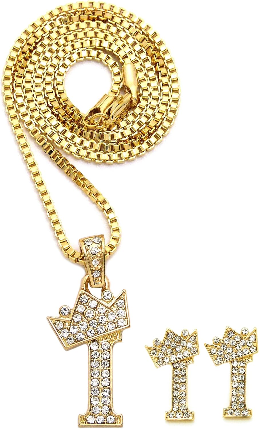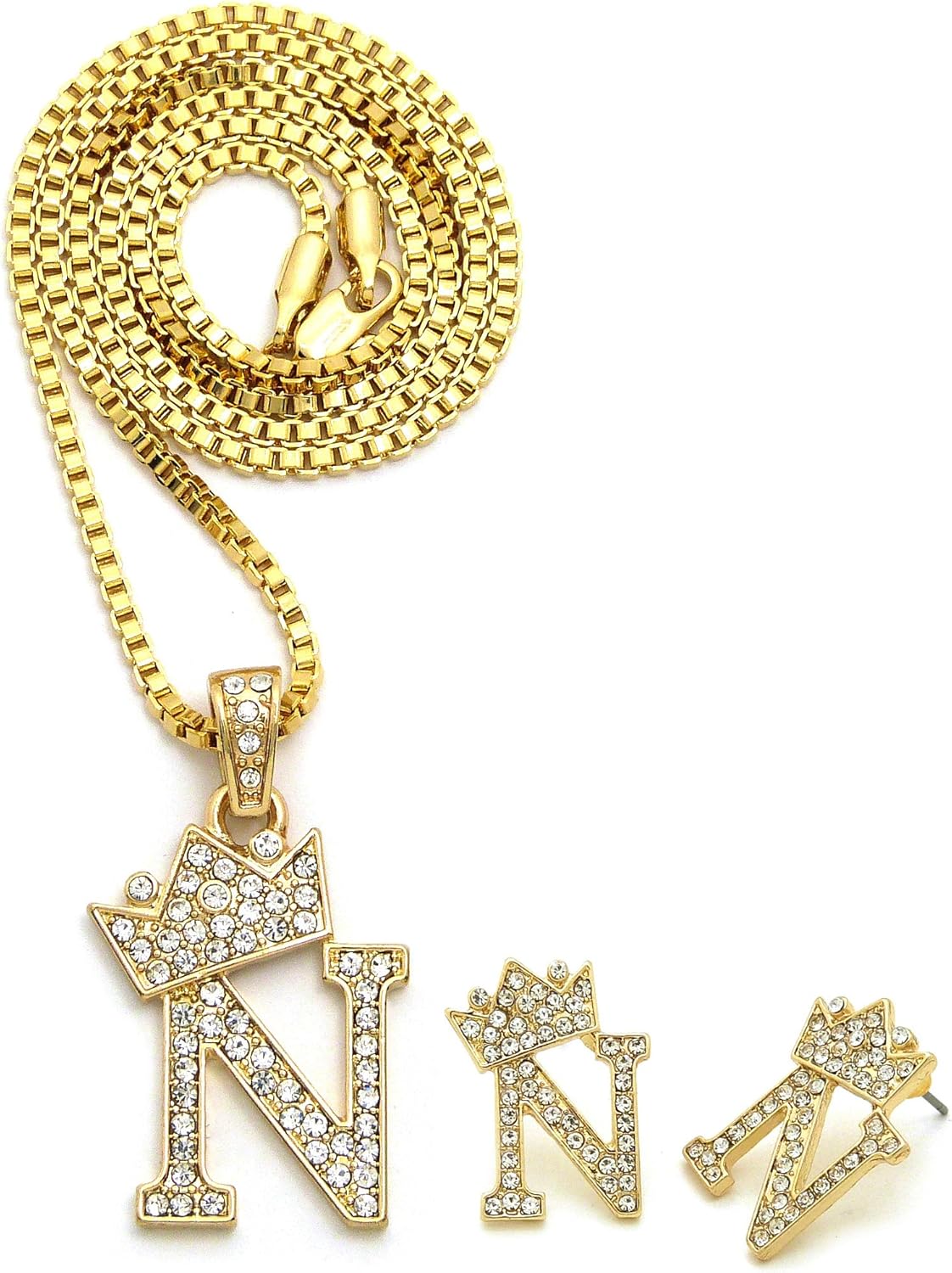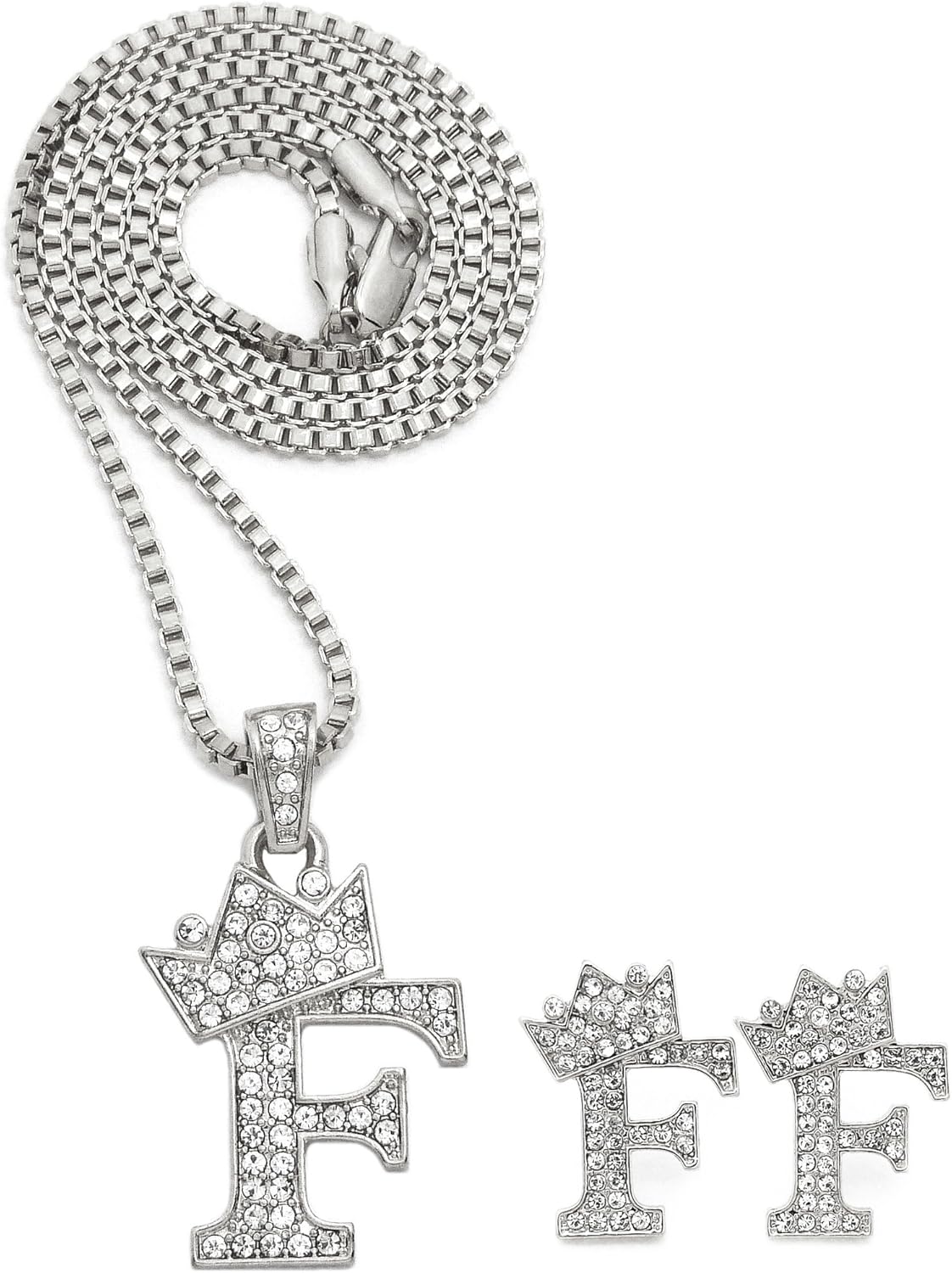 Unisex Small Size Pave Initial Alphabet Letter Pendant 24" Box Chain Necklace & Earring Set