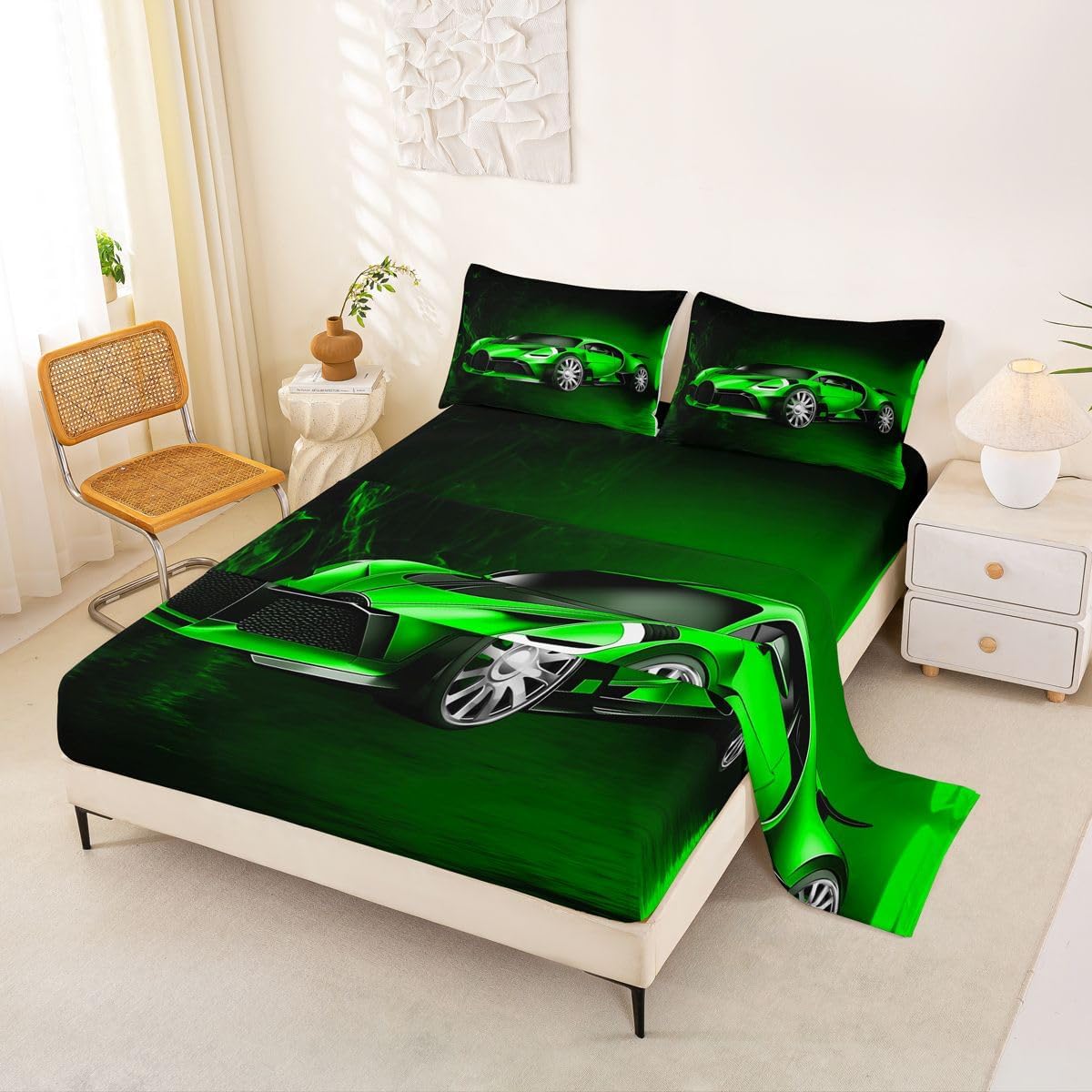our bedroom decor bed sheets set look with the vivid stylish and elegant print specifications: Twin Sheet Set: 1 twin fitted Sheet 39 inch x75 inch x16 inch, 1 twin flat sheet 66 inch x96 inch and 1 pillowcase 20 inch x30 inch Full sheet set: 1 full fitted sheet 54 inch x 75 inch x 16 inch, 1 full flat sheet 81 inch x 96 inch and 2 pillowcase 20 inch x 30 inch Queen sheet set: 1 queen fitted sheet 60 inch x 80 inch x 16 inch, 1 queen flat sheet 90 inch x 102 inch and 2 pillowcase 20 inch x 30 inch deep pocket fitted sheet with elastic all around materials: microfiber fabric, lightweight and soft design: With vibrant and novelty designs and 3d print technique, this duvet cover is very suitable as room decor for boys and girls care instructions dry clean preferred; machine washable, use cold water on gentle cycle, tumble dry low