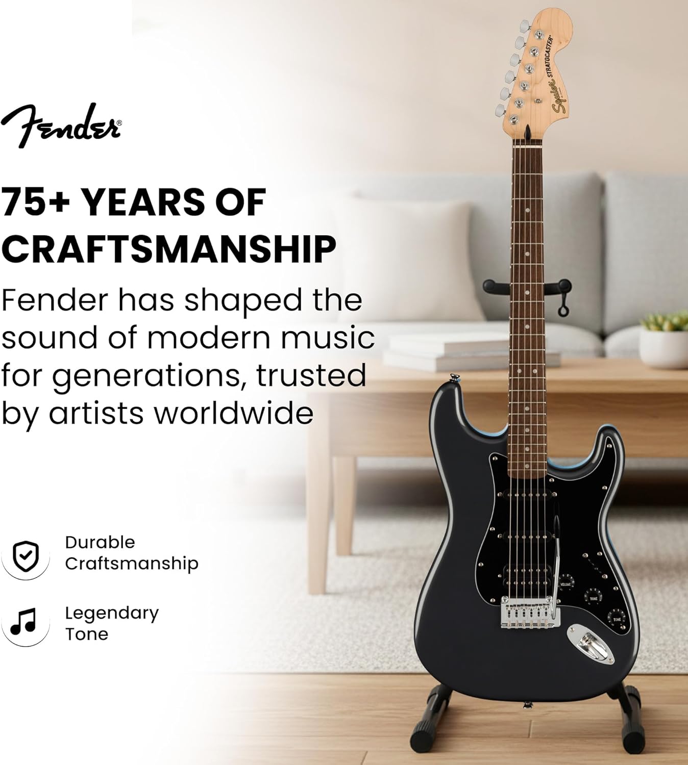 A superb gateway into the time-honored Fender family, the Squier Affinity Series Stratocaster HSS delivers legendary design and quintessential tone for today's aspiring guitar hero. This Strat features several player-friendly refinements such as a thin and lightweight body, a slim and comfortable "C"-shaped neck profile, a 2-point tremolo bridge for superior tremolo action and sealed die-cast tuning machines with split shafts for smooth, accurate tuning and easy restringing. Loaded with a Squier humbucking bridge pickup and single-coil neck and middle pickups for genre-defying sonic variety, this model is ready to accompany any player at any stage.SERIES: Affinity SeriesORIENTATION: Right-HandCOLOR: Charcoal Frost MetallicCOUNTRY OF ORIGIN: IDNECK MATERIAL: MapleNECK FINISH: Satin Urethane with Gloss Urethane Headstock FaceNECK SHAPE: "C" ShapeNECK CONSTRUCTION: Bolt-OnFINGERBOARD RADIUS: 9.5" (241 mm)FINGERBOARD MATERIAL: Indian LaurelBODY: PoplarBRIDGE: 2-Point Synchronized Tremolo with Block SaddlesPICKUP CONFIGURATION: HSSDIMENSIONS: 9.50x24.00x44.00 INSCALE LENGTH: 25.5" (64.77 cm)Adding value to your purchase, Austin Bazaar bundles your instrument with quality accessories, saving you time and money. The included Frontman 10G amplifier allows you play along with your favorite songs or backing tracks, as well as a headphone jack for silent practice. A gig bag is included so you can keep your instrument safely packed away when you're on the go. A strap is included so you can perform while standing. A 3 month trial of Fender Play is included so you can pick up some online guitar lessons. Picks are included so you have extra. An Austin Bazaar instructional DVD is included so you can pick up some tips while learning your new instrument. Everything you need to start playing immediately comes in one box!