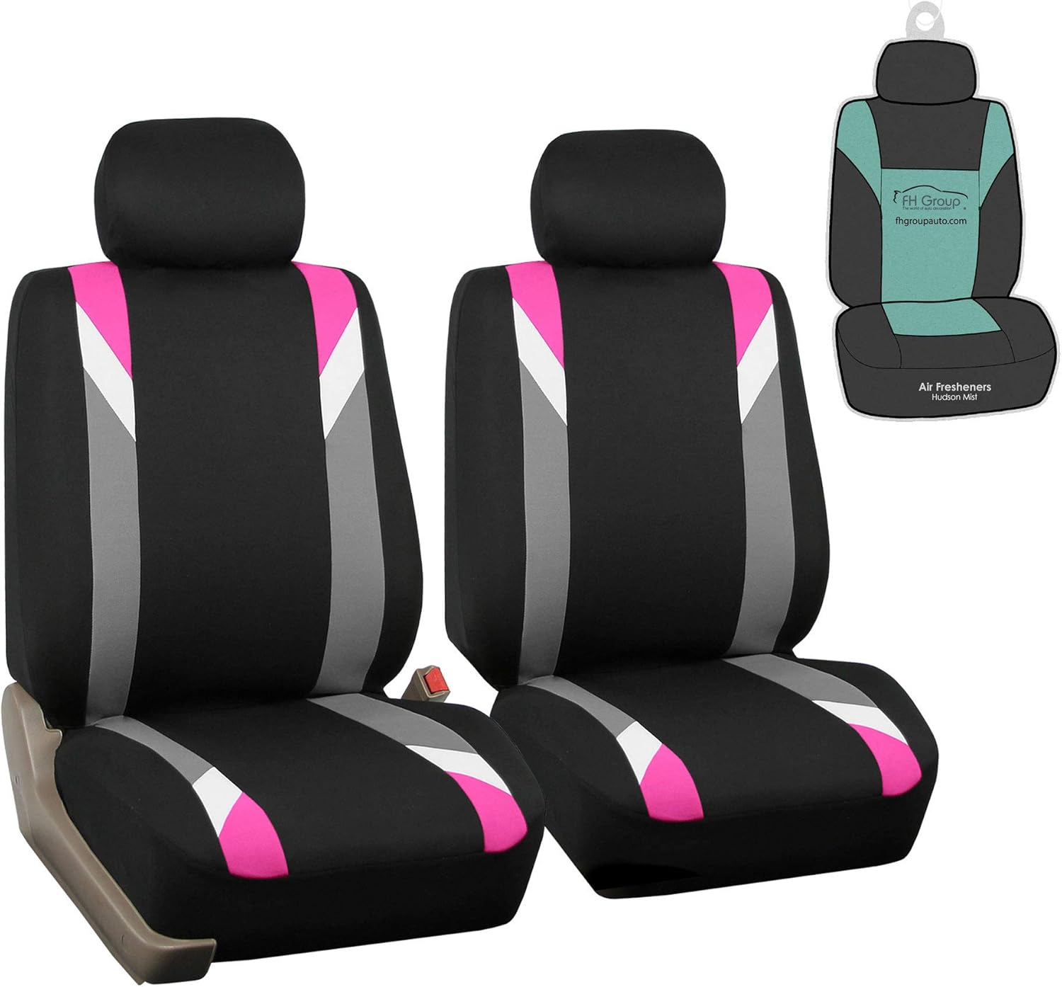 FH Group got you covered! Our full set of premium cloth car seat covers not only provide the best protection for your car's upholstery against any type of mess but they also enhance the looks of your car's interior. No need to worry anymore about spills, stains, mud, or anything damaging your original car seats because this car seat protector got your back. This full set of car seat covers includes two front low back seat covers, which are compatible with most sedans, SUVs, and vansβ seats with removable headrests only. Our rear seat covers are fully compatible with 50/50, 40/60, or 60/40 split rear benches or longer benches. The cover features 3 zippers in the backrest AND bottom, and extra mesh pieces so you can move the rear seat freely or use the middle armrests and get full protection. We understand messes happen, thatβs why these washable seat covers for cars are convenient for any type of driver. We offer automotive seat covers in numerous fabrics, colors, and designs, so you can easily find the seat cover for cars that fits your style the most. We have car seat covers for women, for men and for everyone! FH Group car seat covers are a great car interior accessory for your vehicle. We have it all: car seat covers for SUV, car seat covers for autos, car seat covers for vans, you name it! Add a modern twist to your vehicle's interior with our sleek Modernistic seat covers. The sharp lines and angles in this design command attention, and the pop of color will make sure all eyes are on you. Our fabric is backed by 3mm of foam padding to disperse heat and keep you cool and comfortable, even in the hottest temperatures.