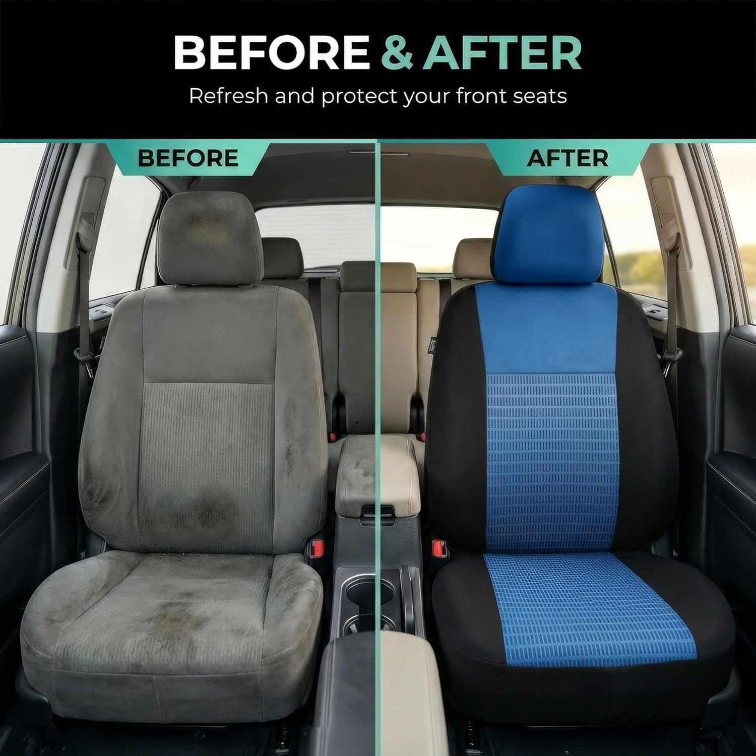 FH Group got you covered! Our full set of premium cloth car seat covers not only provide the best protection for your car's upholstery against any type of mess but they also enhance the looks of your car's interior. No need to worry anymore about spills, stains, mud, or anything damaging your original car seats because this car seat protector got your back. This full set of car seat covers includes two front low back seat covers, which are compatible with most sedans, SUVs, and vansโ seats with removable headrests only. Our rear seat covers are fully compatible with 50/50, 40/60, or 60/40 split rear benches or longer benches. The cover features 3 zippers in the backrest AND bottom, and extra mesh pieces so you can move the rear seat freely or use the middle armrests and get full protection. We understand messes happen, thatโs why these washable seat covers for cars are convenient for any type of driver. We offer automotive seat covers in numerous fabrics, colors, and designs, so you can easily find the seat cover for cars that fits your style the most. We have car seat covers for women, for men and for everyone! FH Group car seat covers are a great car interior accessory for your vehicle. We have it all: car seat covers for SUV, car seat covers for autos, car seat covers for vans, you name it! Add a modern twist to your vehicle's interior with our sleek Modernistic seat covers. The sharp lines and angles in this design command attention, and the pop of color will make sure all eyes are on you. Our high quality fabric is backed by 3mm of foam padding to disperse heat and keep you cool and comfortable, even in the hottest temperatures.