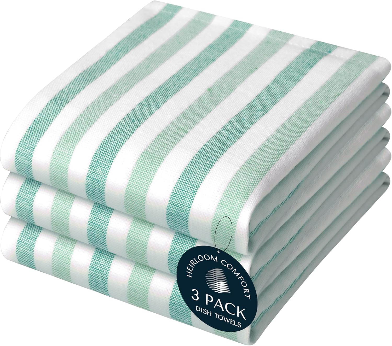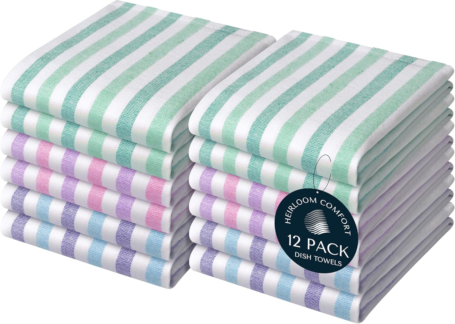 Bring vibrant colors and dependable functionality to your kitchen with our HEIRLOOM COMFORT Fiesta Stripe Kitchen Towels, available in 3 Pack, 5 Pack, and 12 Pack sets. Each of our generously sized towels measures 18x26 inches (45x66 cm) and is made from 100% cotton for ultra-absorbent, quick-drying performance - perfect for drying dishes, wiping down counters, or soaking up everyday kitchen spills. Our classic fiesta stripe design features bold, multicolor patterns that brighten up any space and effortlessly complement modern, rustic, or farmhouse-style décor. Crafted for everyday durability, our kitchen towels are soft, reusable, and machine washable, maintaining their color and shape through frequent use. Whether you're preparing meals, entertaining guests, or handling daily kitchen chores, our multipurpose towels are a stylish and eco-friendly alternative to disposable paper towels. Gentle on hands and surfaces, our towels also make thoughtful gifts and are ideal for use in home kitchens, restaurants, cafes, or catering setups. With a perfect blend of absorbency, strength, and cheerful design, our HEIRLOOM COMFORT Fiesta Stripe Kitchen Towels bring charm and efficiency to every task.