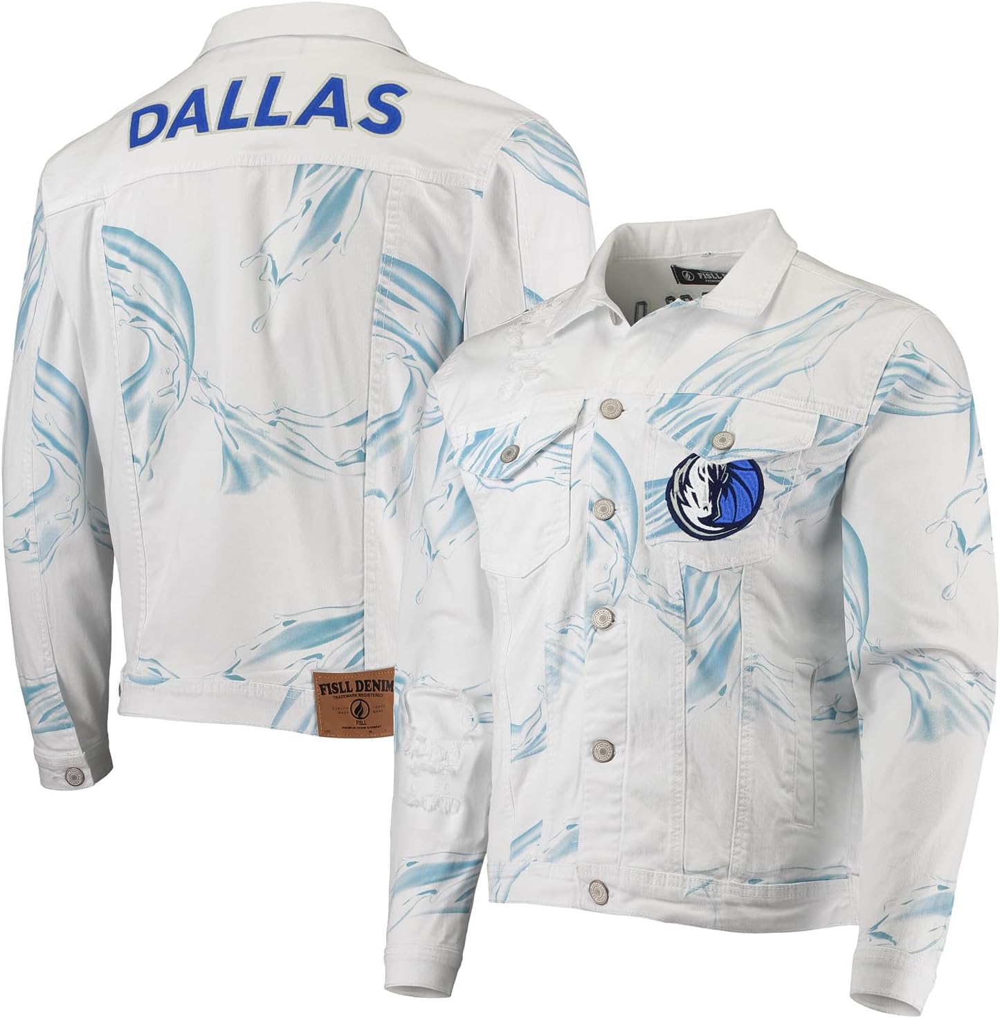 Introducing the FISLL Men's NBA Team Denim Jacket – a premium blend of style, comfort, and team pride that redefines casual outerwear. Crafted for true basketball enthusiasts and fashion aficionados alike, this jacket seamlessly fuses the timeless appeal of denim with the electric energy of NBA fandom. Constructed with meticulous attention to detail, this jacket boasts a classic regular fit that flatters the silhouette while allowing for ease of movement. The medium weight denim fabric ensures both durability and comfort, making it an ideal companion for those brisk game nights or casual hangouts. The classic denim texture is elevated by subtle distressed accents, adding a touch of rugged authenticity to your look. What truly sets this jacket apart is the bold NBA team branding. The front proudly displays the embroidered iconic team logo, instantly signaling your allegiance to your favorite franchise. As you turn around, the back of the jacket showcases the team name in distinctive typography, capturing the spirit of the game in every stitch. These vibrant embellishments are expertly integrated, adding a pop of color to the denim canvas.