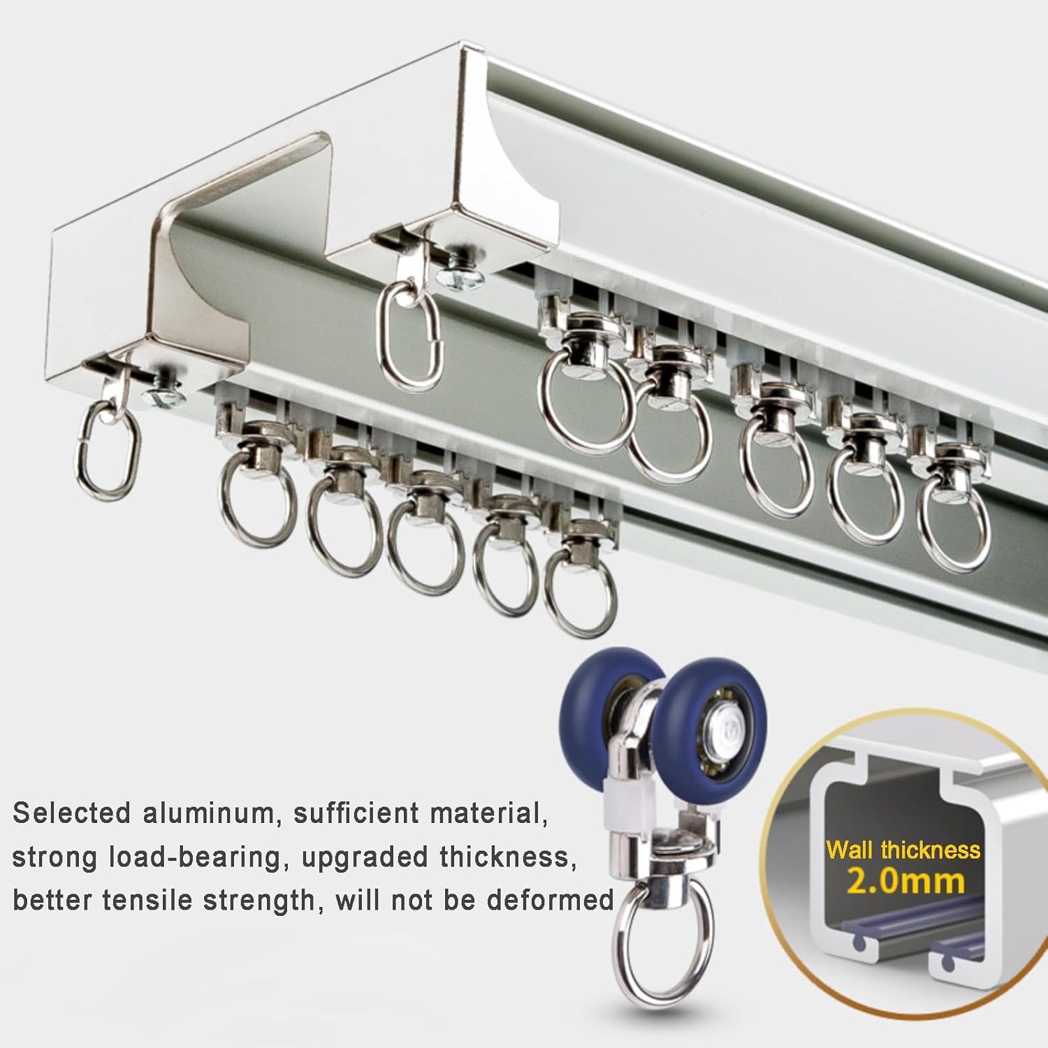 This premium double track curtain track is expertly crafted from robust aluminum alloy, ensuring durability and longevity for your home. Designed with universal silent bearing pulleys, our innovative double track system allows you to effortlessly hang both curtains and sheer curtains simultaneously. Experience the perfect blend of functionality and style, as this track provides excellent load-bearing capacity and smooth sliding motion, making it an ideal choice for enhancing the ambiance of any room.Product Features:- **Product Name:** Mute Double Track Curtain Track- **Material:** High-quality aluminum alloy- **Type:** Double track straight design- **Color Options:** Elegant white and sophisticated champagne- **Aluminum Thickness:** Side thickness of 2.0mm and bottom thickness of 2.6mm- **Installation:** Ceiling mounted with a straightforward installation process—simply drill and fix without complicated instructions.- **Track Design:** Double-layer structure allows for flexible light and privacy adjustments for your living space.Included in the Package:- **Curtain Track:** Available as per your requirements- **Pulleys:** 16 pieces per meter- **End Caps:** 2 pieces per set- **Connector:** Included for seamless joining of tracks that exceed length limits.Please Note:1. Minor measurement discrepancies of 1-3 cm may occur due to manual measurements.2. In cases where the length surpasses transport limitations, the curtain track will be cut. A connector will be provided to ensure ease of use without compromising functionality.