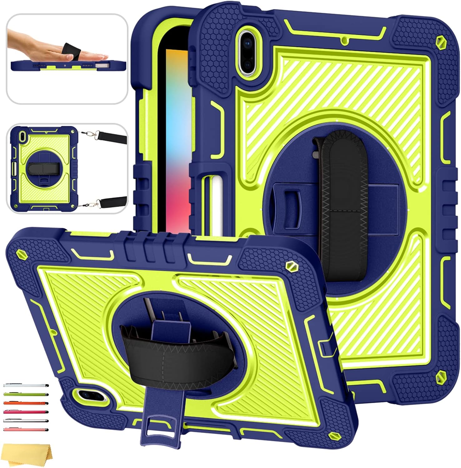 Compatible Models: Compatible with Apple iPad (A16) 11th Generation 11 Inch (2025 release) (Model Number: A3354 A3355 A3356); Compatible with Apple iPad 10th Generation 10.9 Inch (2022 release), (Model Number: A2696 A2757 A2777); not fit other tablets. Product Features: 1.Full-Body Rugged Protection: Three-layer protection, crafted with a hard PC inner shell, hard bumper and flexible silicone outer layer, this case absorbs shock and resists scratches, bumps, and drops. Engineered for ultimate durability in everyday use or outdoor adventures. 2.360° Rotating Stand Case: built-in 360-degree rotating stand—perfect for landscape or portrait mode. Ideal for video calls, reading, or streaming on your tablet. 3.Adjustable Hand Strap & Detachable Shoulder Strap: with a soft, adjustable hand strap for one-handed use and a detachable nylon shoulder strap for convenient carrying on-the-go. 4.Built-in Pencil Holder: Shockproof and drop-resistant case safely store and access your Pencil or stylus with the integrated holder. 5.Shock Absorbing Corners: 4 Reinforced corners safeguard against drops and bumps, impact resistant corners to absorb impact and avoid scratches. 6.Precise Cut-outs: All cutouts holes for tablet camera, speakers, other ports etc, good gift for boys, kids,girls, women, toddler, men, business, office,schools. 7.Screen & Camera Protection: Designed with raised bezels around the screen and camera, this case keeps your device's display and lenses elevated off flat surfaces to avoid scratches, cracks, and smudges. Package Includes: 1. 1 x Case for iPad (A16) 11th Generation 11 inch (2025) & FOR iPad 10th Generation 2022 (10.9 Inch) protective case 2. Bonus: 1 x Stylus Pen 3. Bonus: 1 x Cleaning Cloth
