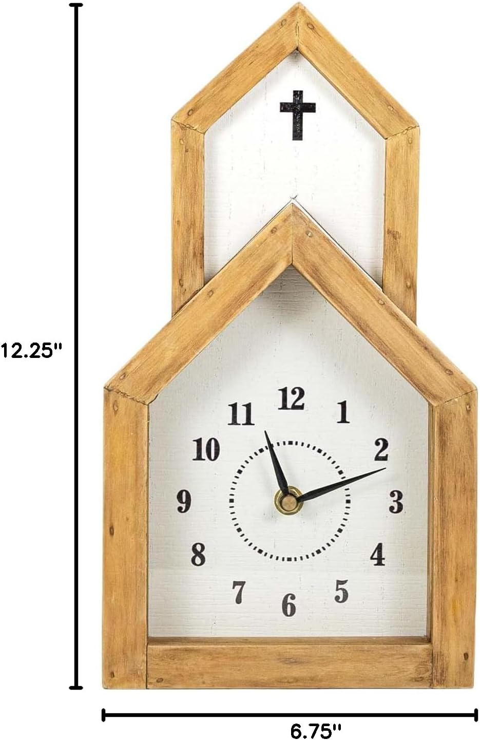 A charming tabletop clock designed in the shape of a traditional church. With its natural wood border and clean white clock face, it is sure to bring a touch of timeless style to any room. The glass front adds elegance, while the classic design ensures it will never go out of style. Whether you're looking for a unique conversation piece or a reliable timekeeper, this church-shaped clock is sure to suit your needs.