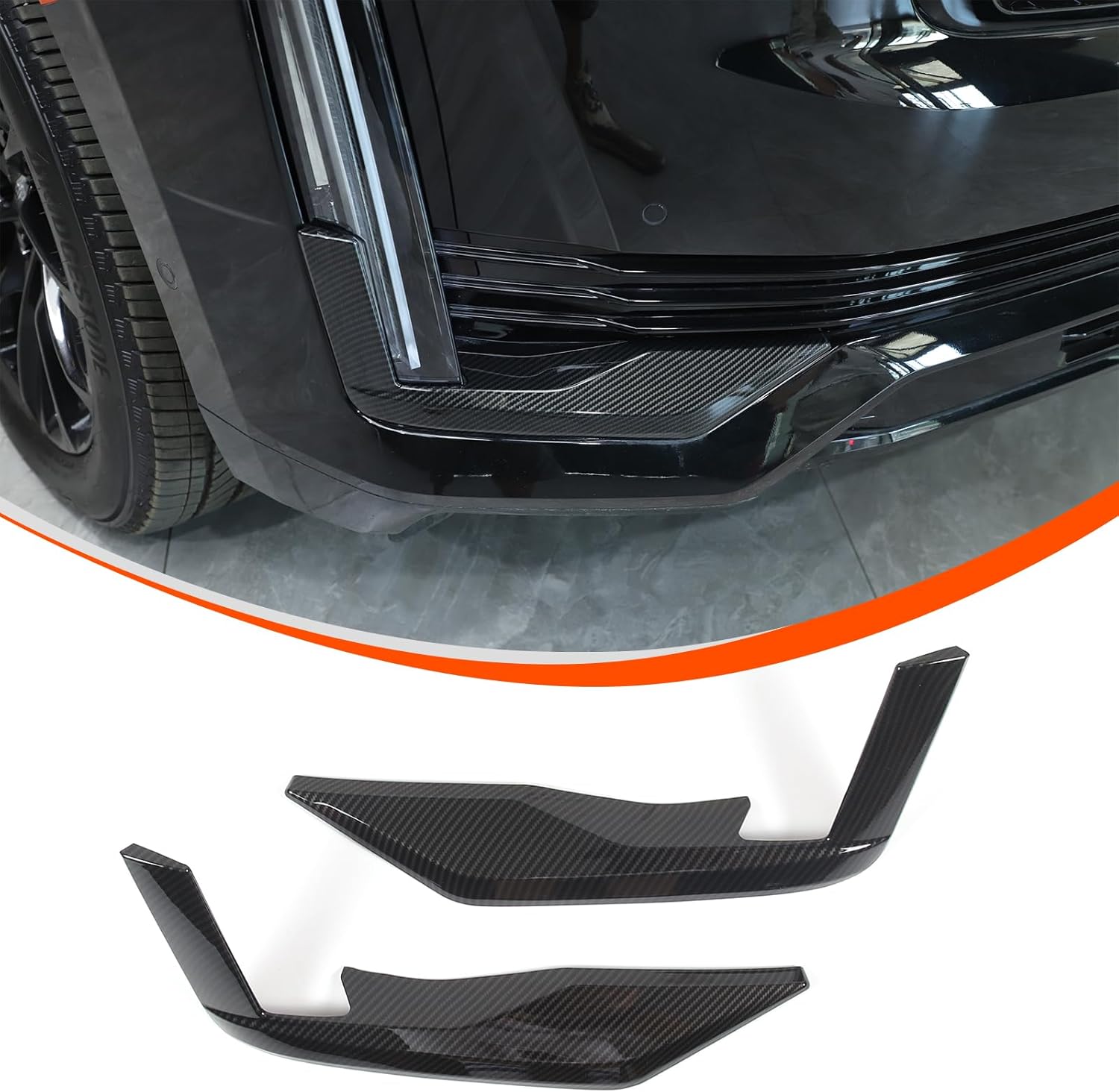 Front Left Driver & Right Passenger Side Bumper Guard Pad Cap Cover Feature: Provides a high class and Sport decor style for your Cadillac Escalade 2021 2022 2023, change the ordinary interior style of the car and add distinctive color. We collect raw data, perfect integration, easy installation ,It can cover existing scratches and prevent your car from scratch and abrasion. Material:This Daytime Running Lights Vent Canard Strip Eyelid Eyebrow Daytime Headlight Trim Cover Made of high quality ABS Plastic . Package Include: 2PCS Front bumper Bottom corner Cover trim Accessories. Installation method: 1.The Accessories back of the come with 3M tape. 2.Wipe clean the around in advance, and keep dry and clean. 3.Tear off the tape and press it tightly, and the installation can be completed quickly and easily. 4.If the weather is cold. Please use the hair dryer(hot air blowing)in order to provide the best viscous. 5.Please keep dry after been install at least 72 hours. Or it will easy to fall off. 6. Any quetion about installation, please feel free contact us. NOTES: Please check whether this item can fit on your car before purchasing Why Choose Our Product? Easy and quick installation even for beginners. Made of high quality material for long term use. This product is manufactured in the original version of the original car 1:1,perfect fit in without gap. 360 degree baking finish with smooth surface and luxury high end look. quality standard, as good as the original ones. High-quality after-sales service, buy with confidence.