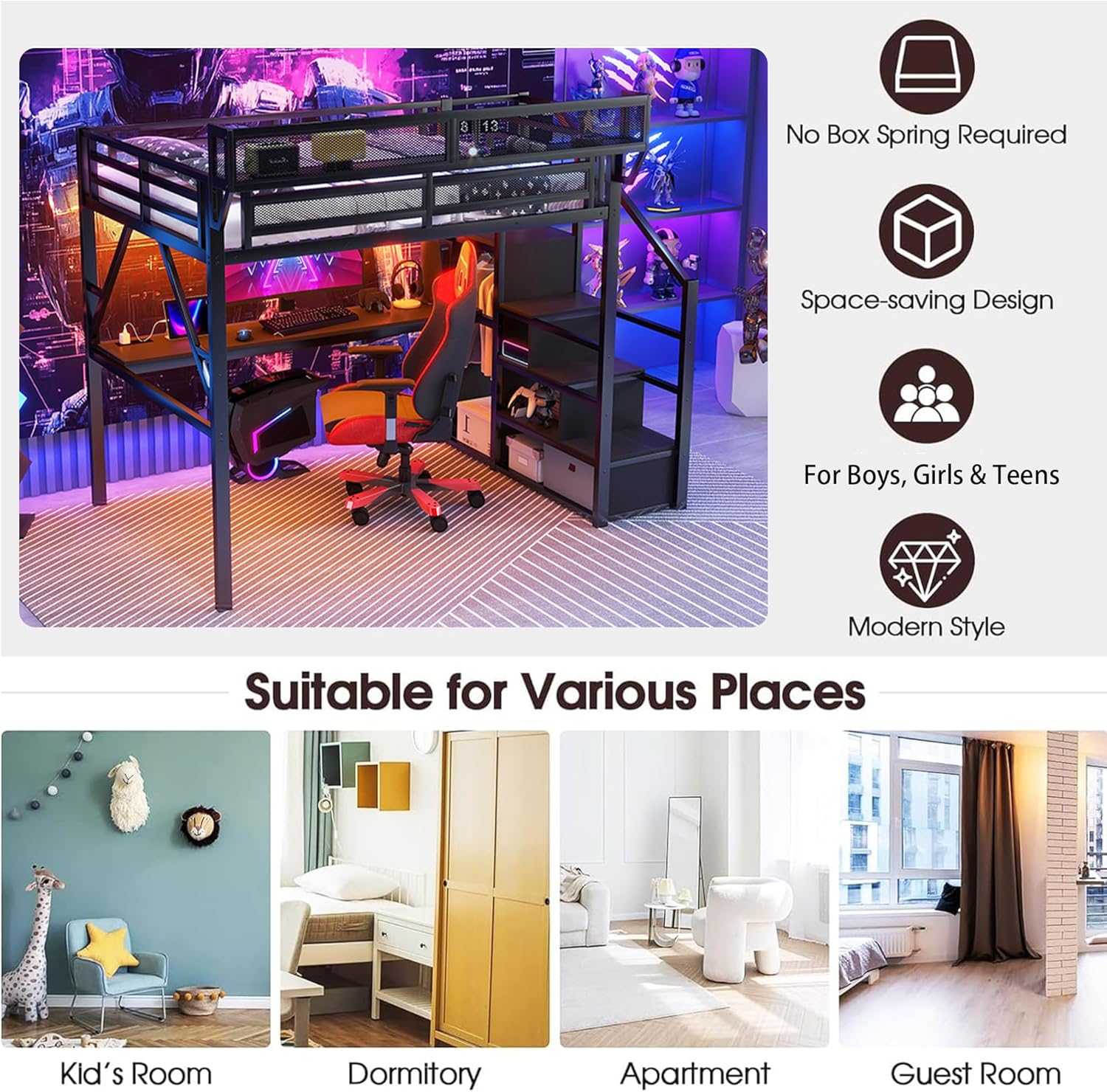 | Other Special Features of the Product | Built-In Upper Storage Shelf, Heavy-Duty Metal Frame, RGB LED Lighting System, Staircase with Hidden Storage, Wardrobe + Desk Combination |