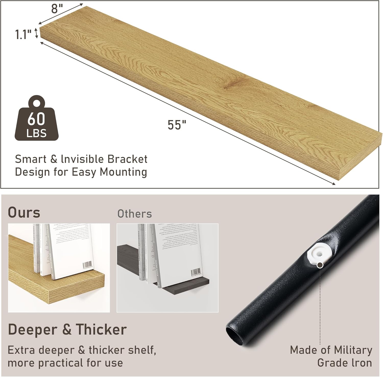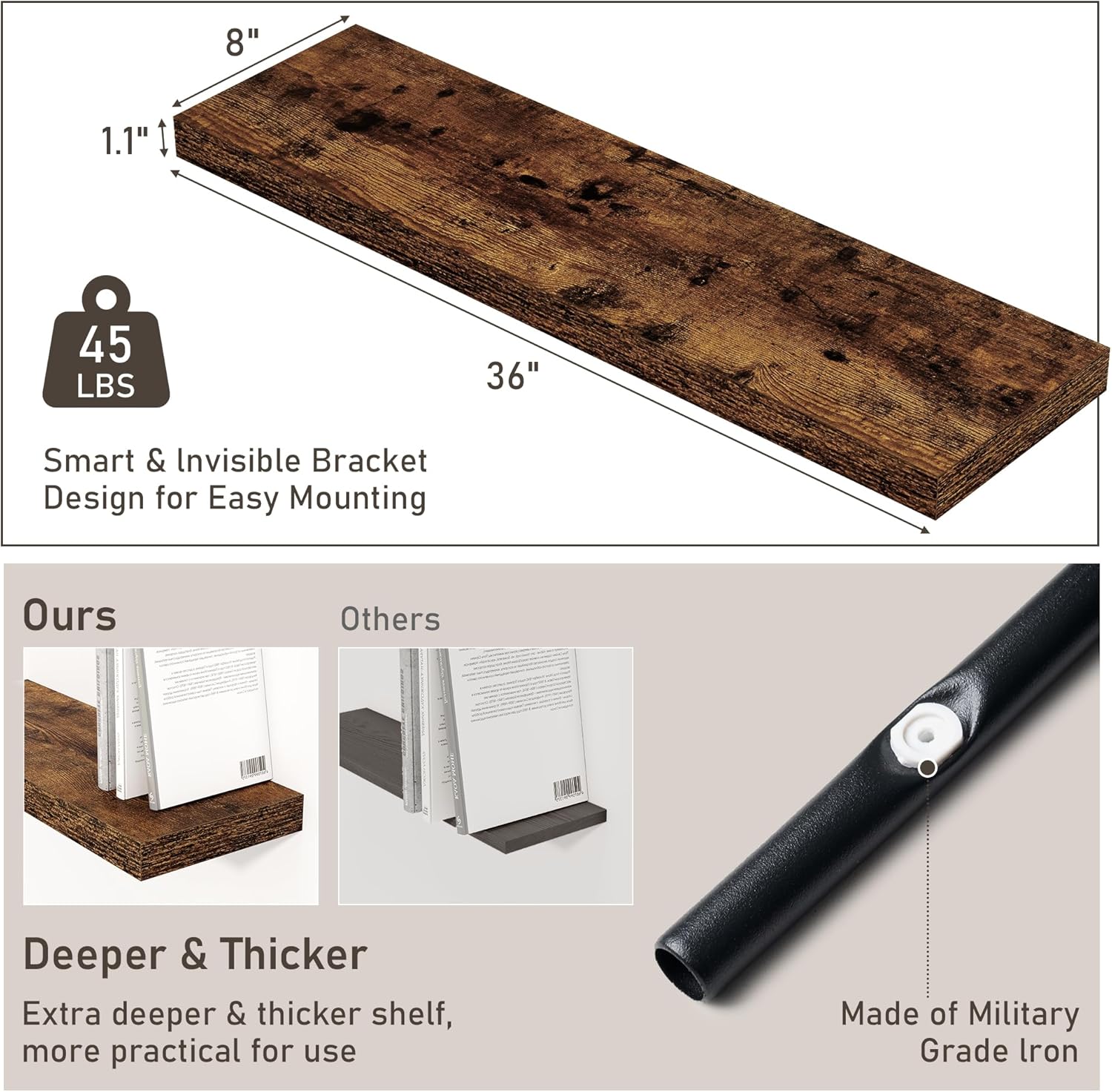 | Included Components | Easy-to-Follow Instruction Manual, Heavy-Duty Screws & Wall Anchors, Leveling tool (bubble level), Military-Grade Iron Mounting Brackets, Premium Engineered Wood Shelves |