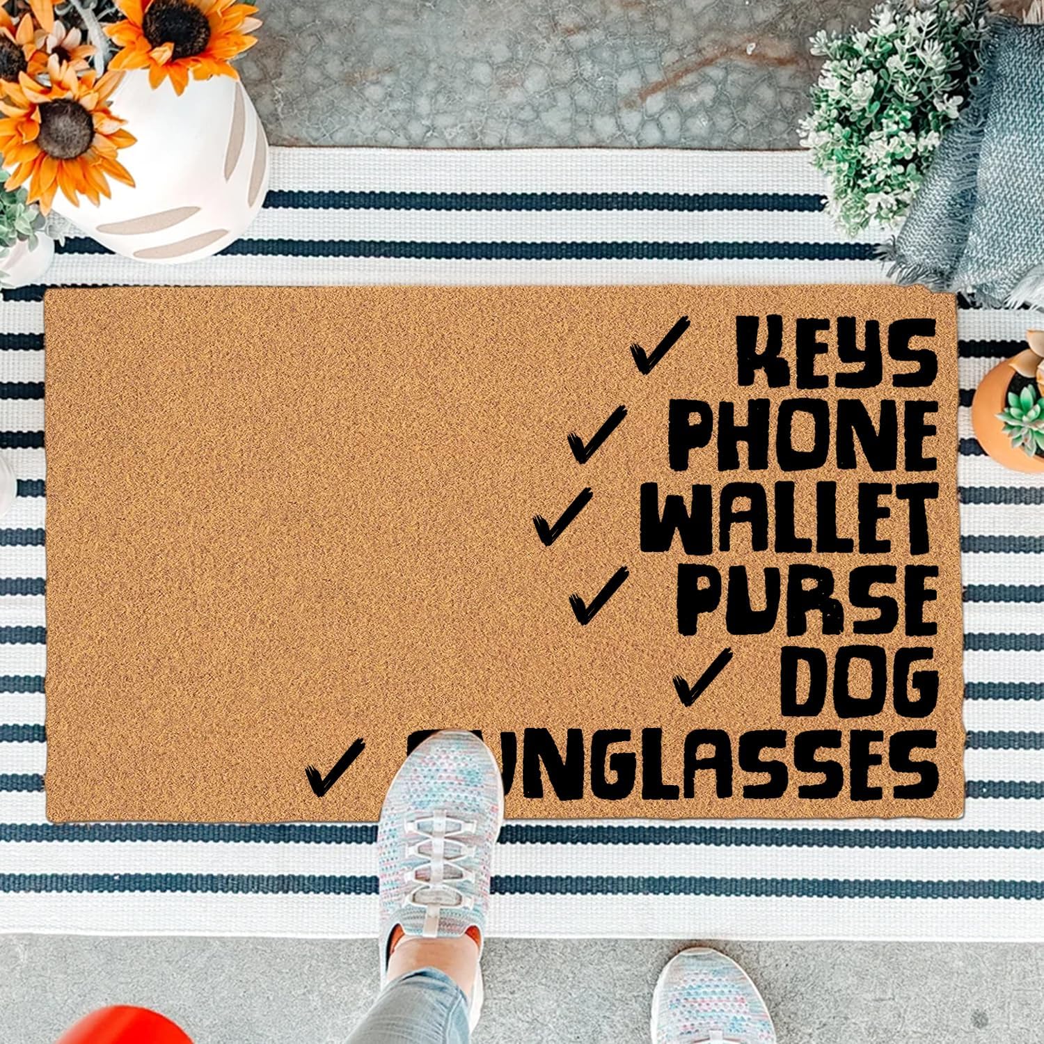 Packages List : 1 x DoormatItem Size : 18"(W) x 30"(L) 3/16" thickness Product Highlights: ▲ High-Quality Material: Designed with a non-woven fabric surface and a sturdy non-slip rubber base, this doormat ensures secure placement on any floor, including hardwood. Safe for kids and pets, it’s also machine washable for effortless maintenance.▲ Eye-Catching Design: Showcases bold, personalized patterns with funny themes like witty quotes, anime, movie references, dogs, flamingos, cacti, or beach vibes, transforming this welcome mat into a standout decor piece.▲ Multi-Purpose Use: Ideal as a welcome mat for front doors, entryways, kitchens, or living rooms. This versatile doormat enhances home decor in offices, patios, or farmhouse settings.▲ Perfect Gift Idea: With its unique, colorful designs, this doormat makes a thoughtful housewarming gift, birthday surprise, or festival present, suitable for any celebration.▲ Key Notes: Crafted as a thin doormat for indoor use, it blends practicality with stylish charm, elevating your home’s ambiance.