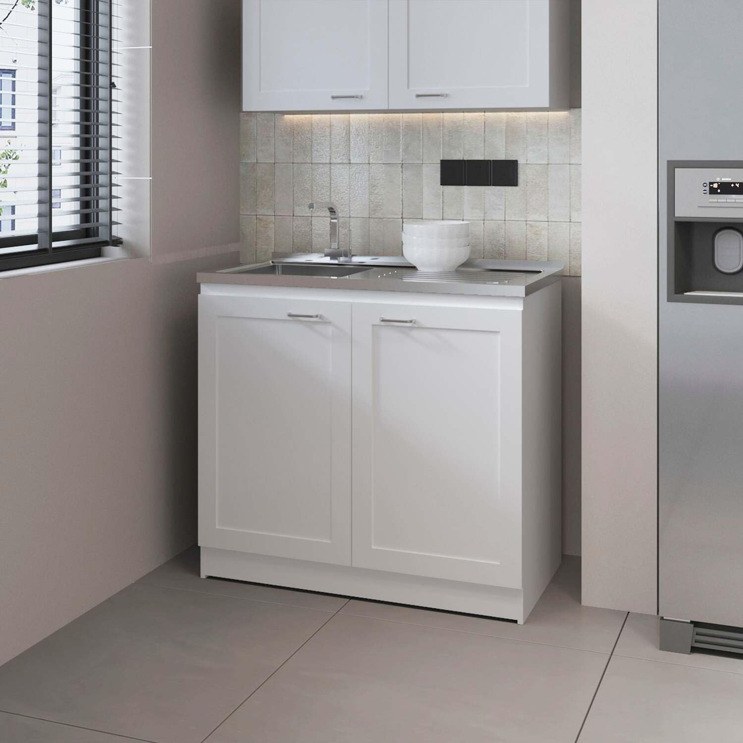 Specifications Product type: Utility Sink Material: Particle Board Overall Dimensions:2.2*39 * 36 inches Color: White,black Style: Modern Fits:Kitchen ,Living room,Bathroom Ample Storage Space – Features a double-door compartment with an interior shelf for organized storage of kitchen essentials. Integrated Sink – Designed for convenience, providing a practical washing area for various kitchen tasks Dimensions: 36" (H) x 39,4" (W) x 20,2" (D)." Scratch-resistant surface: The melamine coating is specially designed to resist scratches, keeping the bookcase looking new even with daily use FM FURNITURE Haivana Utility Sink Base Cabinet with Double Doors and Interior Shelf, White "Utility Sink Cabinet – Enhance your kitchen with a practical and stylish utility sink cabinet. Designed with ample storage space, it features a double-door compartment with an internal shelf to keep your essentials organized. The integrated sink provides convenience for daily tasks, while its sturdy and functional design ensures durability and efficiency. Ideal for optimizing space and adding a touch of modern functionality to any kitchen. Materials: Particle board and Melamine Dimensions: 36" (H) x 39,4"(W) x 20,2" (D)." The faucet is not included, allowing you the freedom to select your favorite faucet that matches your unique style. With a spacious interior shelf ideal for organizing kitchen essentials and providing added security, the cabinet's doors ensure peace of mind while keeping your items in order