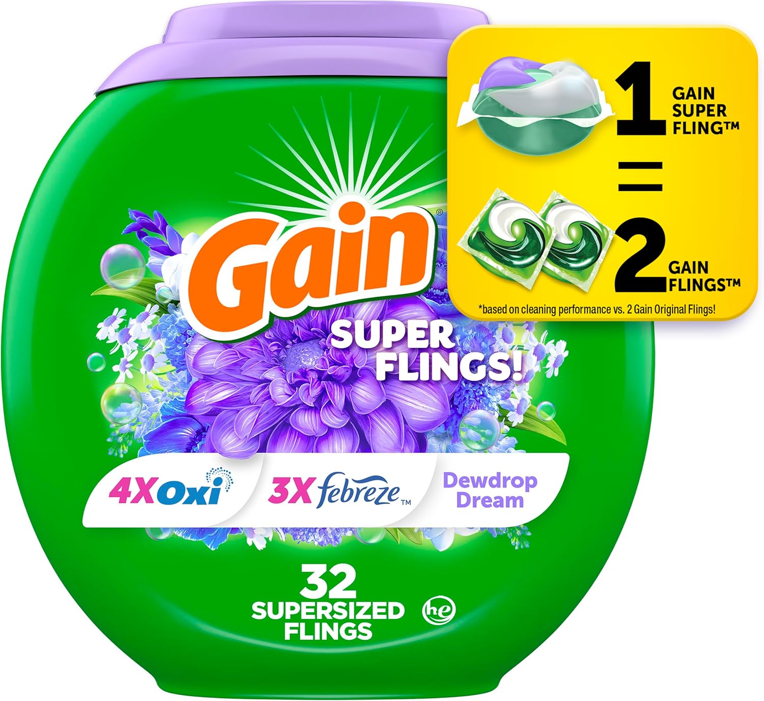 New Gain Super Flings deliver an irresistible clean and fresh laundry experience with 4X Oxi Cleaning Power and 3X Febreze freshness*. Available in Hibiscus Hula and Dewdrop Dream, these laundry detergent Super Flings treat your nose to a premium scent experience that is made to elevate your laundry routine. Designed to work in all washing machines and water conditions, these laundry pacs help make laundry day easier. Just toss one Gain Super Sized Fling with Dewdrop Dream scent into the washing drum before adding fabrics to enjoy joyful freshness. When using Gain Super Flings laundry detergent pacs, be sure to place the detergent pac in the drum before clothes to help get the best clean possible. Gain Super Flings are formulated so one Super Fling laundry pac equals the cleaning performance of two Gain Original Flings, based on cleaning performance. Enjoy Gain Super Flings detergent pods for a fresh and clean laundry experience. *4X cleaning ingredients and 3X freshness ingredients vs Gain Original liquid detergent.