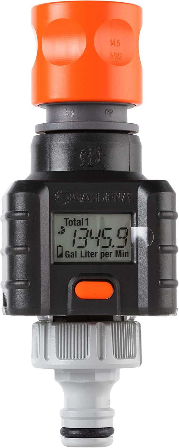 The innovative GARDENA Water Smart Flow Meter allows targeted irrigation that is measured and mindful. At a glance, you can see 1. the water consumption per day, 2. the water consumption per season, 3. the water consumption per watering session 4. the current flow in litre per minute. The consumed water quantity can be read at any time on the large display and thereby controlled. With a single button for all functions, the Water Smart Flow Meter is easy to use. Until now, irrigation has been a matter of personal judgement and one's form on the day. The Water Smart Flow Meter ensures that you have better control. From now on, you can water in a targeted, requirement-suitable and systematic way. This is good for the garden, the environment, and the wallet. The Water Smart Flow Meter is battery-operated and can be immediately connected to the tap, to a sprayer, a sprinkler or a pump. The robust and impact-proof Water Smart Flow Meter is simply clicked onto the Threaded Tap Connector or Standard Hose Connector and immediately supplies important data through active measurement. An integrated battery-level display secures precise operation. This innovative meter raises awareness of water consumption. Hozelcock compatible.
