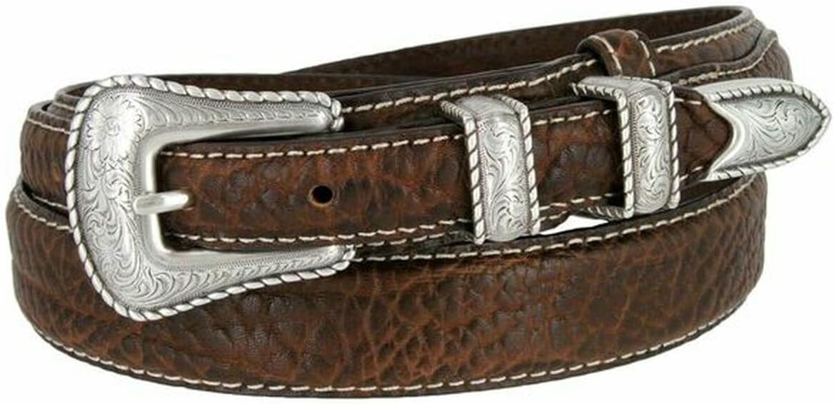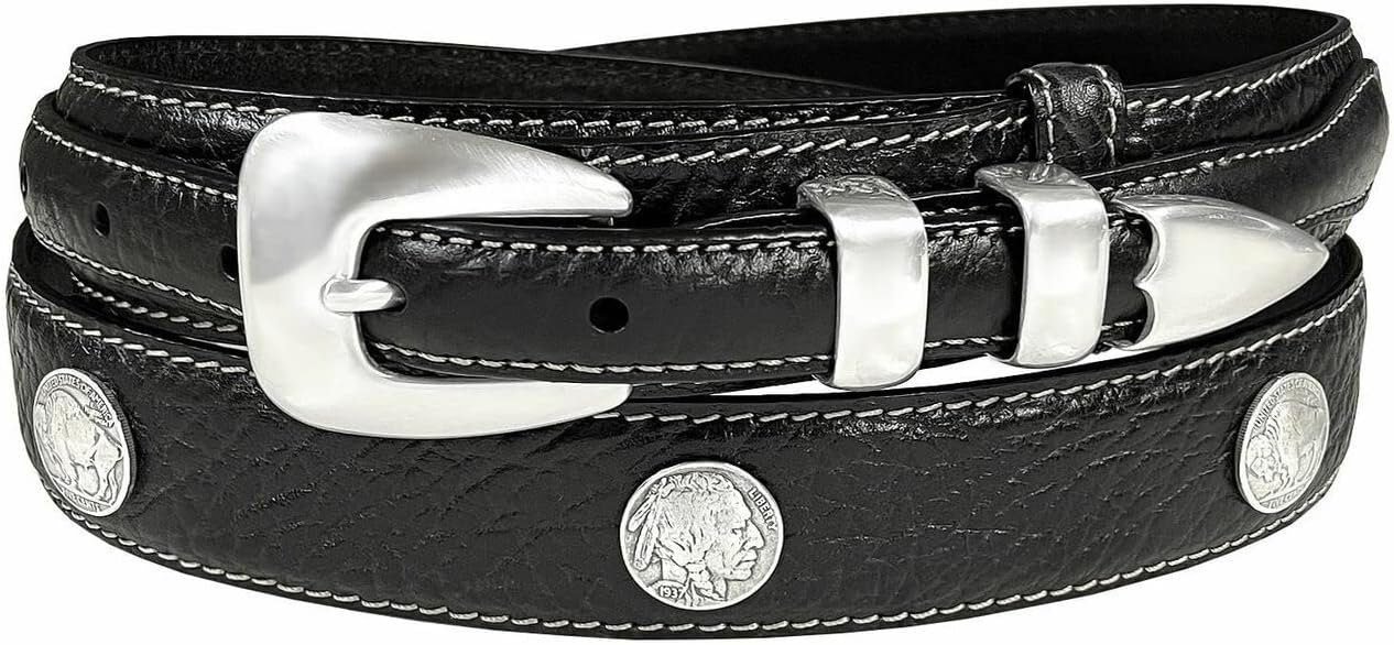 Made from High-quality leather. Antique silver floral engraved 4-piece buckle set and five star conchos. 1-3/8"(35mm) taper down to 3/4"(19mm) wide western ranger belt with 7 belt holes for plenty of room for adjustments to offer maximum comfort. Convenient snap system for interchanging buckles making it a versatile strap for different occasions. Our belts are measured from the fold where the buckle is attached to the middle hole. If you wanted to get the best size we recommend measuring a belt that works for you from the fold to the hole where you wear the belt.