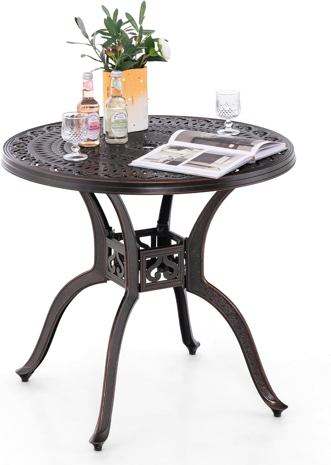 Description:This outdoor cast aluminum dining table will be a perfect addition to both indoor and outdoor occasions.Made of high-grade cast aluminum with coated surface, the table resists well to rust and deformation, ensuring high load capacity and long service life. The bottom footpads can be adjusted to keep the table stabler. Equipped a practical 2” umbrella pole hole in the middle, the outdoor dining table allows you to always sit in the sunshade without hotness. In addition, the waterproof surface makes daily maintenance quite effort-saving. With elegance look and spacious storage space, this cast aluminum dining table will be a good choice if you are looking for a table to match your patio dining chairs.Features:36” wide table is perfect for 4 people to sit aroundSuitable height and much space under the table for more convenienceMade of sturdy and durable cast aluminum for long using timeAdjustable and non-slid footpads make the table stand more stably2” umbrella holes are designed for almost all kinds of patio umbrellasNice-looking patterns add a piece of eleganceSuitable for both indoor and outdoor occasionsEasy to assemble and clean, saving much effortSpecifications:Color: Antique BrownMaterial: Cast AluminumOverall Dimension: 36" x 28.5" (D x H)Diameter of Umbrella Hole: 2 InchNet Weight: 24 lbsWeight Capacity: 165 lbsPackage Includes:1 x Outdoor Round Dining Table; 1 x InstructionWhy You Choose Our Outdoor Dining Table?√ Sturdy cast aluminum structure for high stability and durability√ Elegant appearance makes it perfect for multiple places