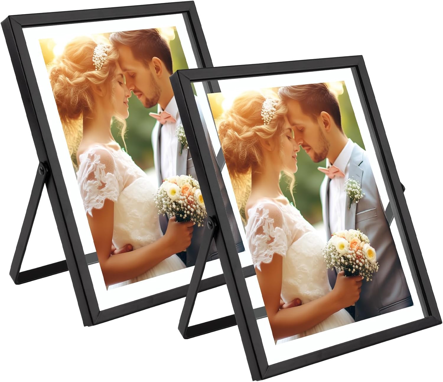 Golden State Art, 2 Pack, 8x10 Inch Metal Picture Frames, Floating Display for 7x9, 6x8 Photos, with Real Glass and Pull-Out Easel Stand for Tabletop Display (Vertical) - Matte Black