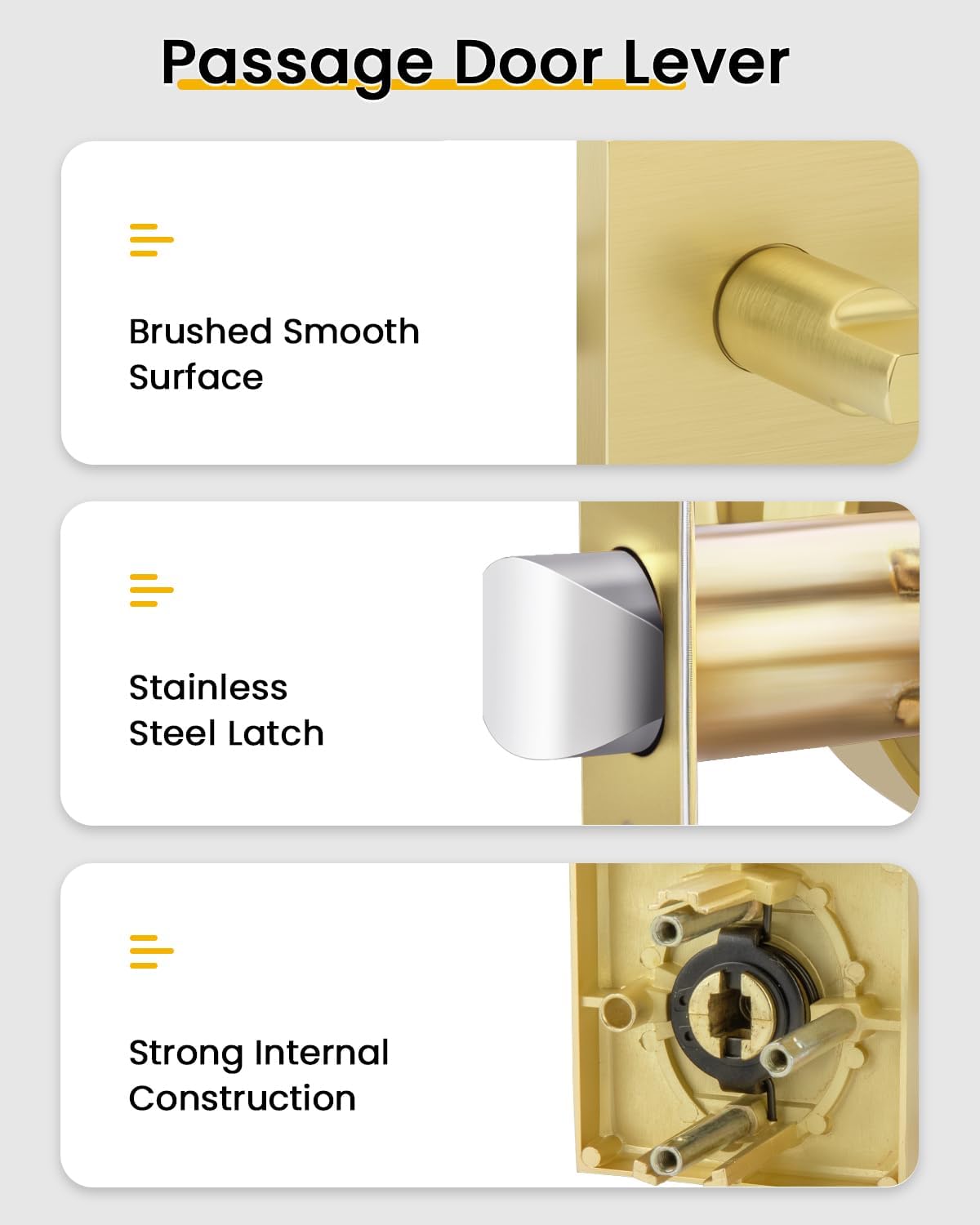 • Interior Passage Door Handles for Hallway & Living Areas —— Interior gold passage door handles for doors that do not require locking, such as hallways, living rooms, kitchens, and closets.