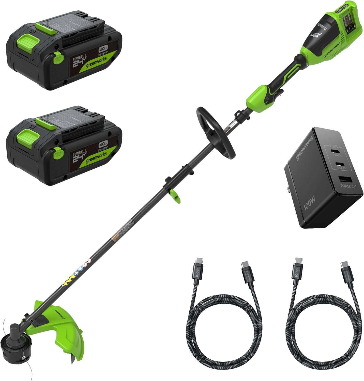 The Greenworks 48V (24V x 2) 15” Cordless String Trimmer comes with (2) 2Ah Batteries and a Dual Port Rapid Charger. The toughest weeds and grass are no match for the TORQDRIVE System which provides 30% more torque. A 15-inch cutting path and a .080" bump feed head makes line advancement quick and easy. The variable speed trigger allows you to control the cutting speed making it easier to maneuver around plants and allows for longer runtimes. The Greenworks 24V lithium-ion platform powers over 150+ indoor and outdoor products, including lawn mowers, blowers, string trimmers, chainsaws, power tools, and more! The 24V lithium-ion battery provides 20% more power and 35% more run time while delivering fade-free power with no memory loss after charging. The outdoor power equipment allows you to tackle up to 1/4 acre with the available batteries. The Greenworks 24V platform comes with a 3-year tool/battery warranty to protect your investment.