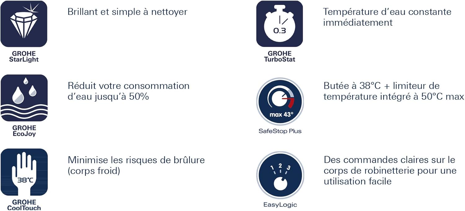 Thanks to the GROHE TurboStat technology, this shower thermostat will deliver the desired water temperature reliably within a fraction of a second. To protect you and your family from scalding, it comes with a preset temperature limit of 38C. If desired, higher temperatures can be selected upon deactivating the SafeStop button. In this mode, the SafeStop Plus feature ensures that the temperature will never exceed 50C, and the thermostat will always be safe to touch thanks to the GROHE CoolTouch technology. To contribute to environmental conservation, the integrated EcoButton allows you to reduce your water consumption by up to 50% while showering. Crafted with ergonomically shaped metal handles and finished in glossy GROHE StarLight chrome, this exposed shower thermostat will be a stunning eye-catcher in your bathroom.
