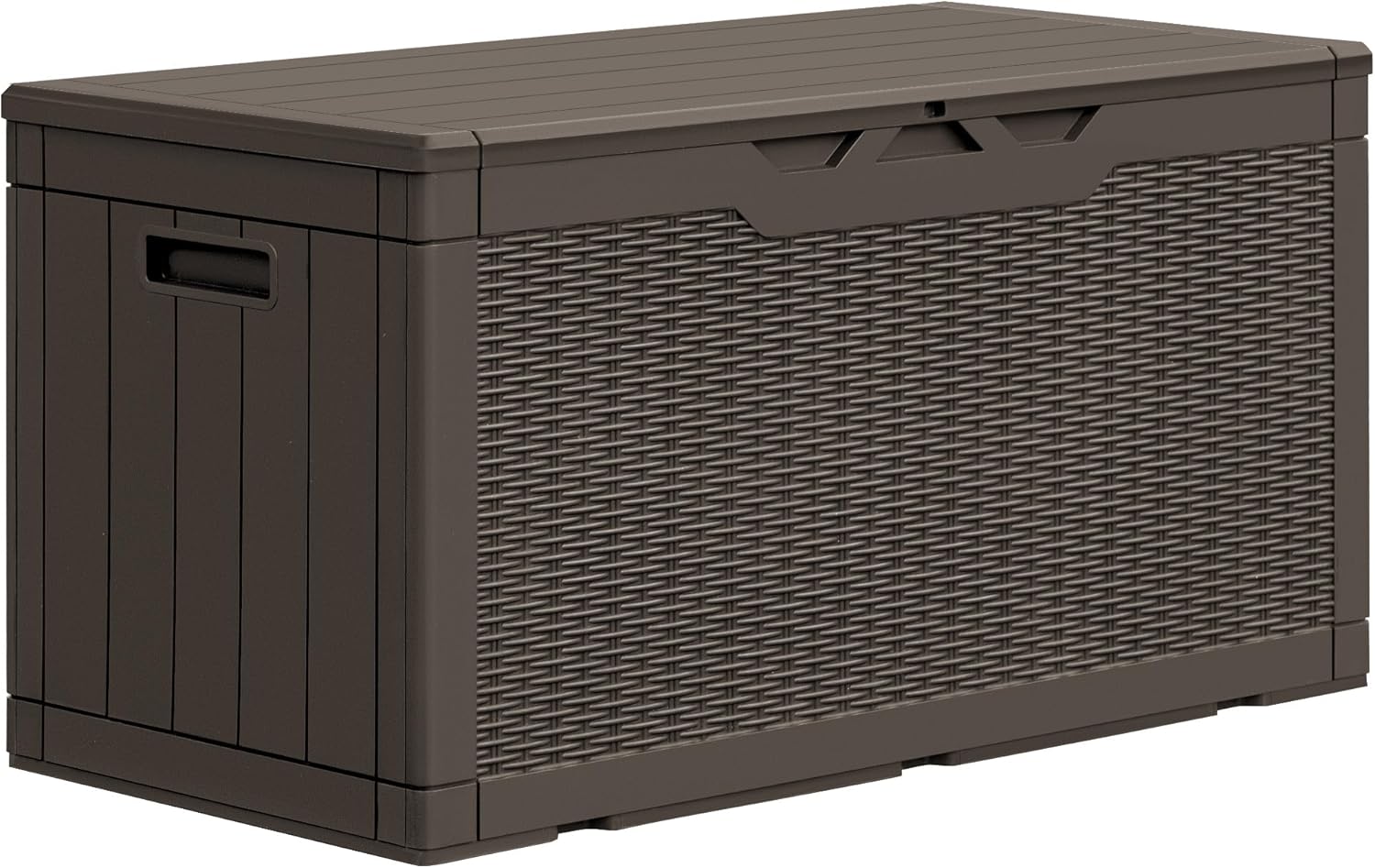 GUNJI is a professional furniture product company that focuses on providing customers with indoor and outdoor furniture, such as sofas, rattan chairs, dining set, lounge chairs, etc. Our company’s products pursue high standard designs in terms of materials and processes. High quality and excellent service are all our company's guidelines. Specification:Material: Resin Color: Black/Brown/Gray/Light BrownStyle: ModernOverall Dimensions: 48" x 23" x 24.5" (L x W x H)Storage Capacity: 100 gallonsSpecial Feature:-The outdoor storage box is designed with a lockable hole, you can add a lock to the box for security when not in use-Each side of the waterproof storage box has a handle, which makes it easy to move the box outdoors at any time-The maximum weight capacity of the deck box is 500 LBS and can as a bench to sit about 2-3 adultsPackage Includes:-100 Gallons storage box x 1-Installation manual