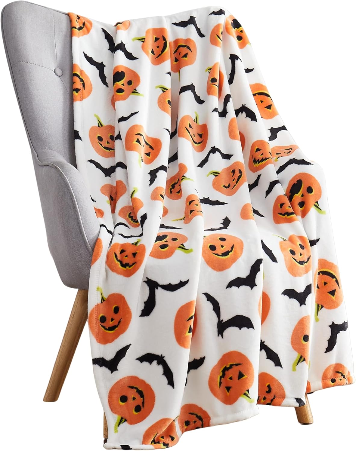 Bring the spooky spirit of Halloween into your home with this charming fleece throw blanket featuring a delightful pattern of classic holiday motifs on a crisp white background. The playful design showcases grinning jack o'lanterns, witches' hats, striped boots, mysterious black cauldrons, and flying bats scattered across soft velvet fleece material. Perfect for curling up on chilly autumn evenings, this cozy throw adds a festive touch to any sofa, bed, chair, or dorm room. The blanket combines comfort with holiday cheer, making it an ideal accent piece for seasonal decorating or a thoughtful gift for Halloween enthusiasts. The contrasting orange and black design elements pop beautifully against the white backdrop, creating an eye-catching pattern that coordinates well with other Halloween decor. Whether you're settling in for a scary movie marathon or just want to add some seasonal flair to your living space, this versatile throw blanket delivers both warmth and style.