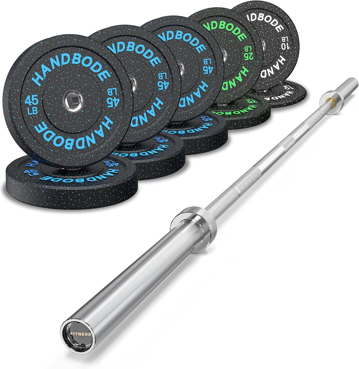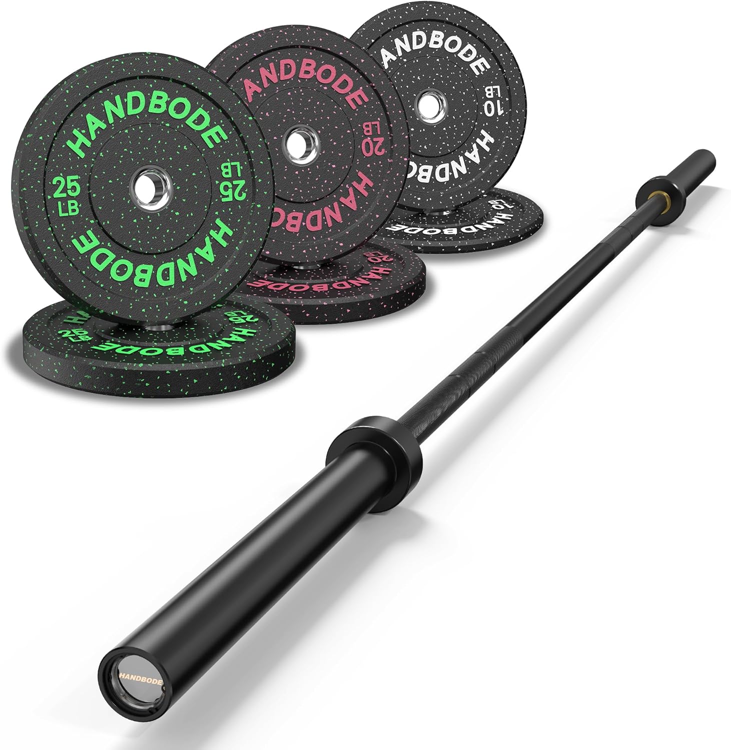 HANDBODE Bumper Plates have the consistent dead bounce, durability, and distinctive smooth finish athletes have come to expect from the HG line. Each bumper is an IWF standard 450MM in diameter, but with a thinner width than most comparable plates on the market, enabling more weight to be loaded on the bar. SPECIFICATION Plate Width Breakdown: 10LB- 1.0 inch 15LB- 1.3 inches 25LB- 1.8 inches 35LB- 2.4 inches 45LB- 2.9 inches 55LB- 3.3 inches Diameter: 450MM (+/- 3MM) / 17.72" (IWF Standard) Collar Opening: 50.40MM / 1.98" Stainless Steel Inserts Minimal Bounce