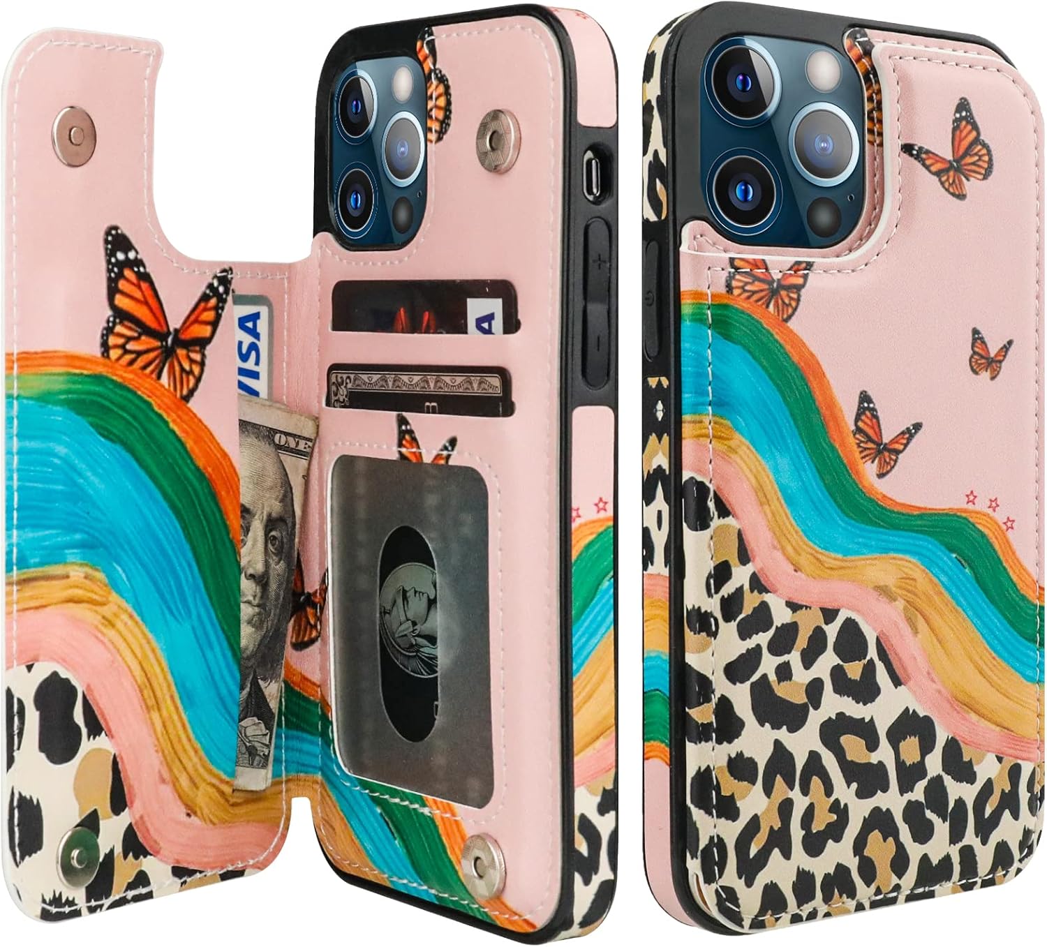 HAOPINSH for iPhone 12/12 pro Wallet Case with Card Holder, Black Leopard Cheetah Print Back Flip Folio PU Leather Kickstand Card Slots Case, Finger Grip Ring Double Magnetic Clasp Shockproof 6.1"