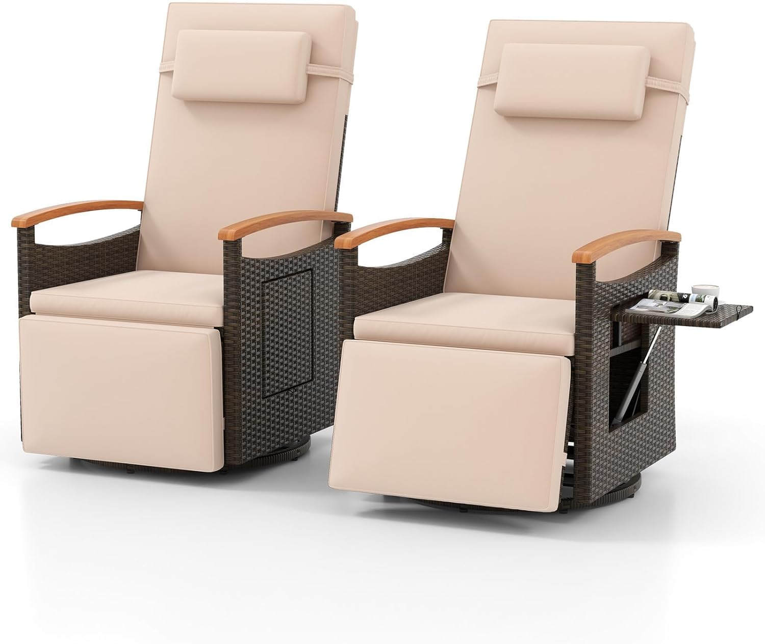 Description: Boasting personalized comfort and a convenient side table, this outdoor swivel recliner is an ideal seating choice for your patio, backyard, poolside, or porch. The adjustable backrest and footrest ensure that you can find a desired angle for maximum relaxation, while the soft pillow and cushions offer added comfort. The acacia wood armrests not only provide support but also add a stylish touch. Crafted from hand-woven PE rattan, the patio reclining chair is sturdy. Additionally, the 360° swivel base allows you to easily socialize with friends or engage with your environment. Features: 150° adjustable backrest and footrest for customizable comfort 360° swivel heavy-duty metal base for convenient use Hand-woven mix brown PE rattan is anti-fading and sun-protective Buffer gas rod and convenient handle make it simple to fold the table Soft pillow and cushions secured by fixing straps, hook and loop fasteners Smooth zippers on the cushion covers ensure simple removal and washing Solid acacia wood armrests for you to comfortably rest your arms User-friendly cut-out handles help you to get up easily Please avoid rain exposure for prolonged service life Specifications: Color of Rattan: Mix Brown Color of Cushion: Beige/Navy Materials: PE Rattan, Metal, Acacia Wood, Polyester, Sponge Product Dimensions: 31”-54” x 32.5” x 41.5”-31”/78-137 x 82 x 105-78 cm (L x W x H) Size of Headrest: 14.5” x 7” x 2”/37 x 18 x 5 cm (L x W x Thickness) Size of Seat: 20” x 20.5”/50 x 51 cm (W x D) Size of Side Table: 10” x 8.5” X 18”/25 x 22 X 45 cm (L x W x H) Size of Footrest: 20” x 11”/50 x 27 cm (L x W) Seat Height (Without Cushion): 14.5”/37 cm Thickness of Cushion: 3”/7 cm Weight Capacity: 400 lbs/180 kg Net Weight: 41.5 lbs/19 kg Package Includes: 1 x Wicker Swivel Recliner Chair 1 x Full-Length Cushion 1 x Headrest 1 x Instruction