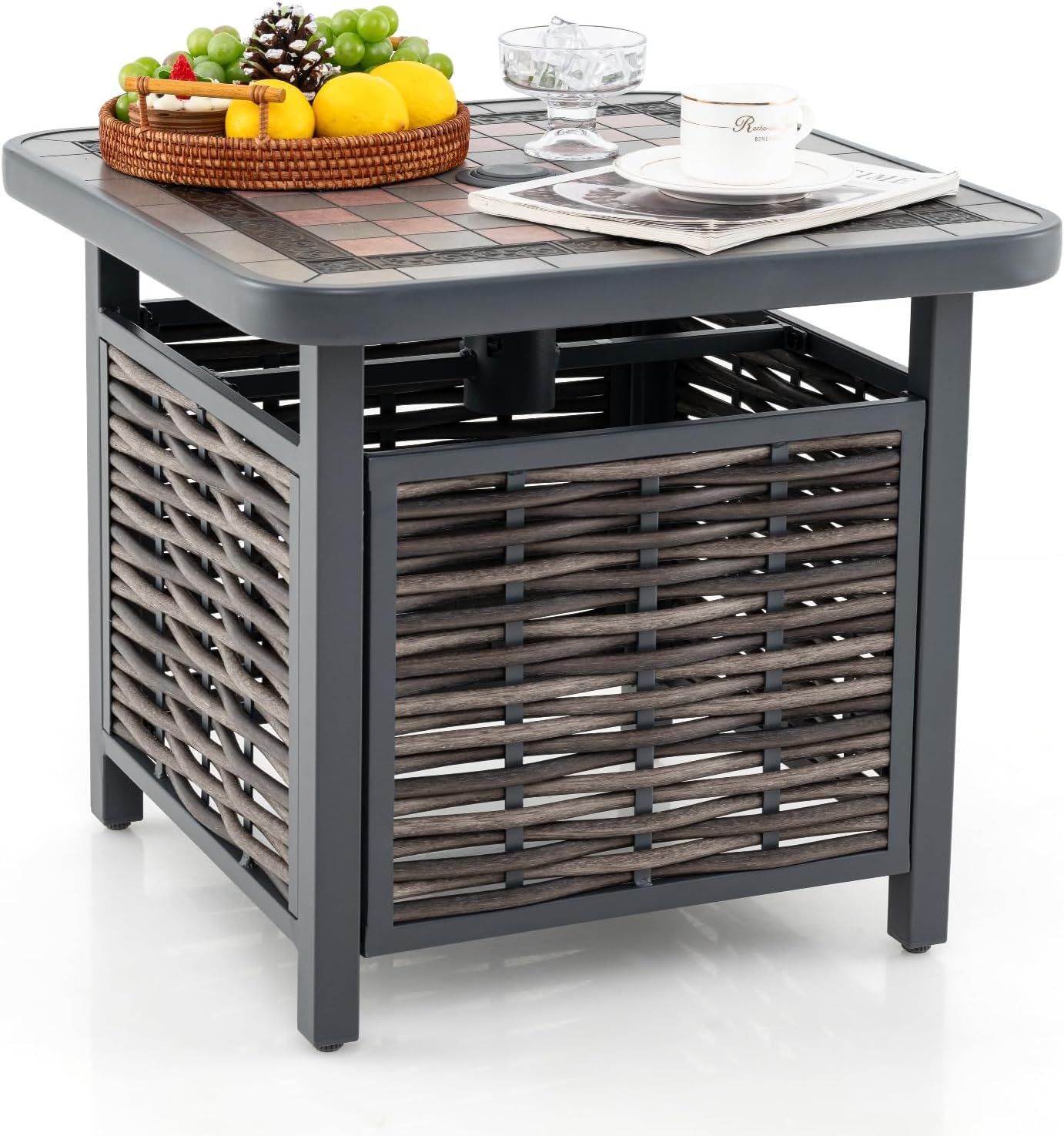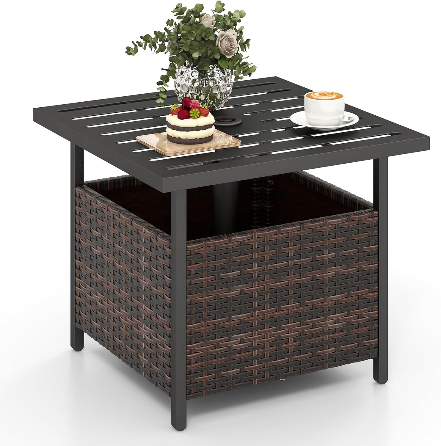 Description: Enhance your outdoor living space with our stylish and functional wicker side table. Featuring a 1.57” built-in umbrella hole and an adjustable knob, it is compatible with various sizes of patio umbrellas, providing shade and comfort. The premium hand-woven PE rattan offers a timeless look, while the slatted metal tabletop ensures sturdy support for drinks, snacks, and magazines. Built with a heavy-duty metal frame and reinforced bottom plate, the patio umbrella table provides exceptional stability. Perfect for gardens, backyards, decks, and poolside areas, it seamlessly blends utility with elegance, making it a must-have for your outdoor spaces. Features: Hand-woven PE rattan offers long-lasting quality and natural beauty 1.57” built-in umbrella hole fits most patio umbrellas Adjustable knob ensures stability no matter the umbrella’s pole size Slatted metal tabletop ensures sturdy support and low maintenance Heavy-duty metal frame with reinforced bottom metal plate for greater stability Non-slip foot pads protect from scratches Suitable for garden, backyard, deck, poolside, etc. Note: the patio umbrella is not included Specifications: Color of Rattan: Mix Brown/Mix Gray/Black Material: PE Rattan, Metal Overall Dimensions: 22” x 22” x 18”/55 x 55 x 46 cm (L x W x H) Diameter of Umbrella Hole: 1.57”/4 cm Net Weight: 21 lbs/9.5 kg Weight Capacity: 165 lbs/75 kg Package Includes: 1 x Outdoor Side Table 1 x Instruction