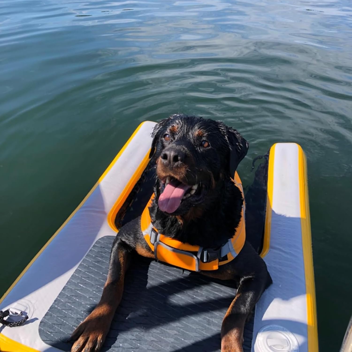 Description:-- This is an excellent water ramp for any water-loving dogs.When inflated to appropriate pressure (which is pretty easy to do with their included pump), it is strong and hard enough to stand on. -- It's meant for dogs, obviously, but it does have a weight capacity of up to 105kg/ 231 lbs, which means even the largest dog can use this with stability.Features:-- Inflatable dog pool water ramp has ties to keep it in place where you set it up, and has sturdy d-ring attachments. -- It also has a nice textured upper so even when wet it doesn't get super slippery.-- It's huge and able to provide a very easy exit from our pool to all my dogs. -- The ramp part is a strong, heavy duty mesh that has strips along it for more grip for paws and claws. -- It sits inside the water so the dog just swims up to the inflated part and will kind of automatically end up with grip on the mesh. -- This setup is definitely helpful for any dog, but particularly for older dogs, dogs with mobility issues, and those that need more support overall when exiting the water. Specifications:-- Material: Polyvinyl Chloride (PVC)-- Width: 100cm/ 39.4inch-- Length: 150cm/ 59inch-- Load Capacity: 105KG/ 231.5 lbs-- Product Weight: 8KG-- Includes Accessories: Storage bag/ Air pump/Rope/ Repair kitPackage Includes:-- 1 × Dog Boat RampNote:-- Because it is processed by hand, the finished product usually has an error of 1-2 cm, please understand.-- Due to differences in some monitors and lighting reasons, there may be a slight color difference between pictures and objects.