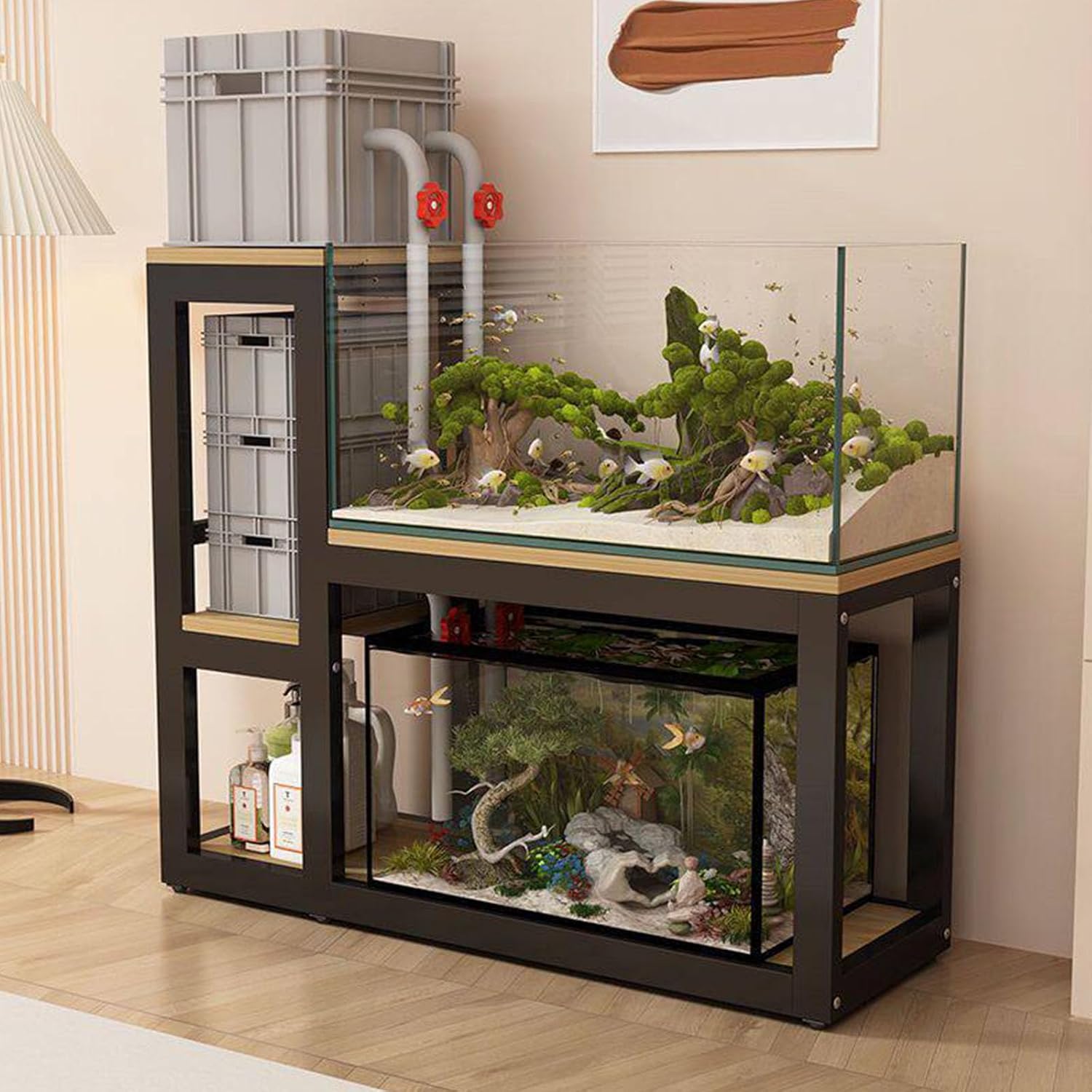 Product FeaturesMulti-tiered storage space accommodates aquariums, filter units and ornaments with ease, efficiently organising diverse itemsErgonomic design facilitates viewing, feeding and routine maintenanceReinforced panels and structural supports ensure stability and durabilitySpacious, sturdy countertop accommodates various aquariums and decorative ornamentsSimple assembly: requires no complex tools, can be swiftly completed by one personProduct Name: Aquarium StandMaterial: Steel frame + eco-friendly boardLength: 90/100/110/120/130 cm (35.4/39.4/43.3/47.2/51.2 inches)Suitable Aquarium Length: 60/70/80/90/100 cm (23.6/27.6/31.5/35.4/39.4 inches)Width: 40/45 cm (15.7/17.7 inches)Height: 110/115 cm (43.5/45.3 inches)Assembly required: YesPackage contents1 x Aquarium base (aquarium tank not included)Important notesThis product is solely an aquarium base; the aquarium tank itself is not included.Dimensions are manually measured and may vary by 1-3 cm from the actual product.Colours may appear slightly different due to screen display variations; the actual product colour shall prevail.