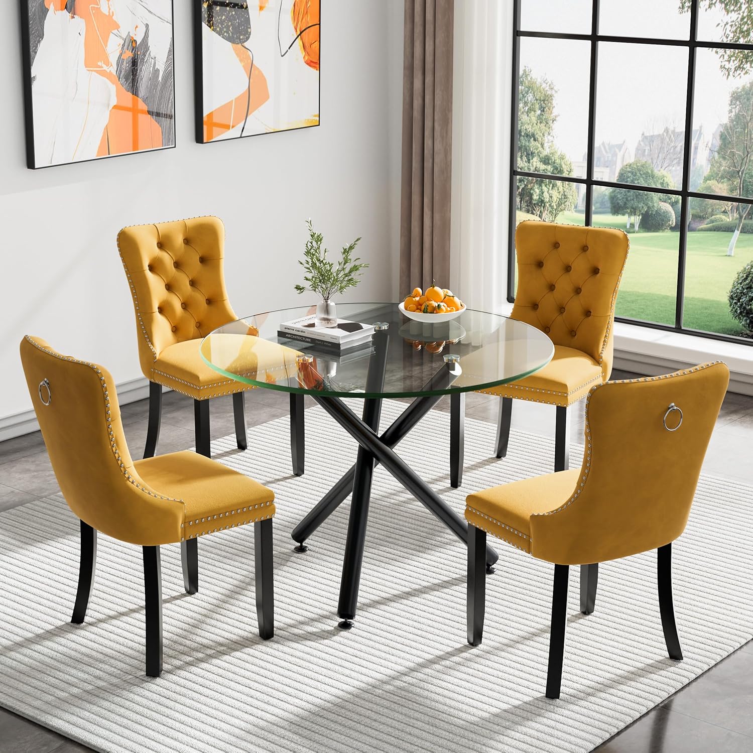 Feature ♥ Package Includes: 1x Round Dining Table; 2 x Chairs, 1x Instruction, Accessory Bag. ♥ This round glass dining table is made of clear glass table top and black metal legs which make ensure stability and durability. ♥ The ergonomics armless dining chair with the thick soft seat provide optimum comfort while sitting. The dining chairs solid wood legs sturdy support to the seat strong bearing strength. ♥ The table frames are constructed of premium metal and have been powder coated to increase their life spans. ♥ This dining table set with a modern and simple style will make a distinctive addition to your kitchen or dining room. ♥ Each chair can bears 280 pounds and table can bears 300 pounds. ♥ Provide with spacious dining space to invite and enjoy breakfast, lunch, dinner and even Afternoon teas with family and friends. ♥ Assembly instruction and assemble tools are included, easy to install.Most people can do in 10-15 minutes.