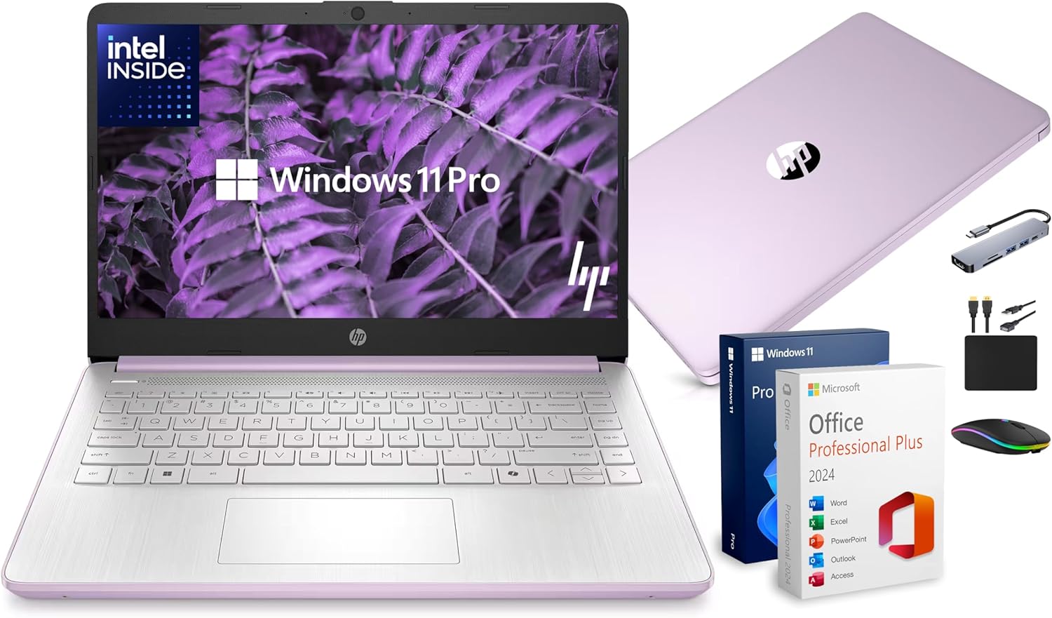 Performance to do more, all day long. Designed for productivity and entertainment, this HP 14-inch laptop features a dedicated Copilot key for instant AI assistance, long-lasting battery life, and a thin, portable design you can take anywhere.Bundle with MarxsolAccessory: 6-in-1 USB-C Docking Station Hub (with USB 3.0, 4K-HDMI, USB-C Connection, SD/TF Card Reader), 500GB external drive, USB extension cord, HDMI cable, mouse pad, and wireless mouseProcessor: Quad-Core Intel Processor N150 (Up to 3.6 GHz Max Turbo Frequency, 6 MB Intel Smart Cache, 4 cores, 4 threads)Graphics: Intel GraphicsOperating system: Windows 11 ProSoftware: Free Microsoft Office 2024Memory: 4GB DDR4Storage: 628GB (128GB SSD + 500GB External Drive + 1TB Cloud Drive)Display: 14-inch diagonal, HD (1366 x 768), micro-edge, anti-glare, 250 nitsConnectivity: Wi-Fi 6 and Bluetooth 5.4 comboAudio: HD Audio with stereo speakersKeyboard: English, natural silver keyboardWebcam: HP True Vision 720p HD camera with temporal noise reduction and integrated dual array digital microphonesPorts:1x USB Type-C 5Gbps signaling rate (supports data transfer only)2x USB Type-A 5Gbps signaling rate1x Headphone/microphone combo1x AC Smart pin1x Multi-format SD media card reader1x HDMI 1.4bBattery: 3-cell, 41 Wh Li-ion battery, Up to 9 hoursColor: Sky BlueDimensions (W x D x H): 12.76 x 8.86 x 0.71 inWeight: 3.24 lbs
