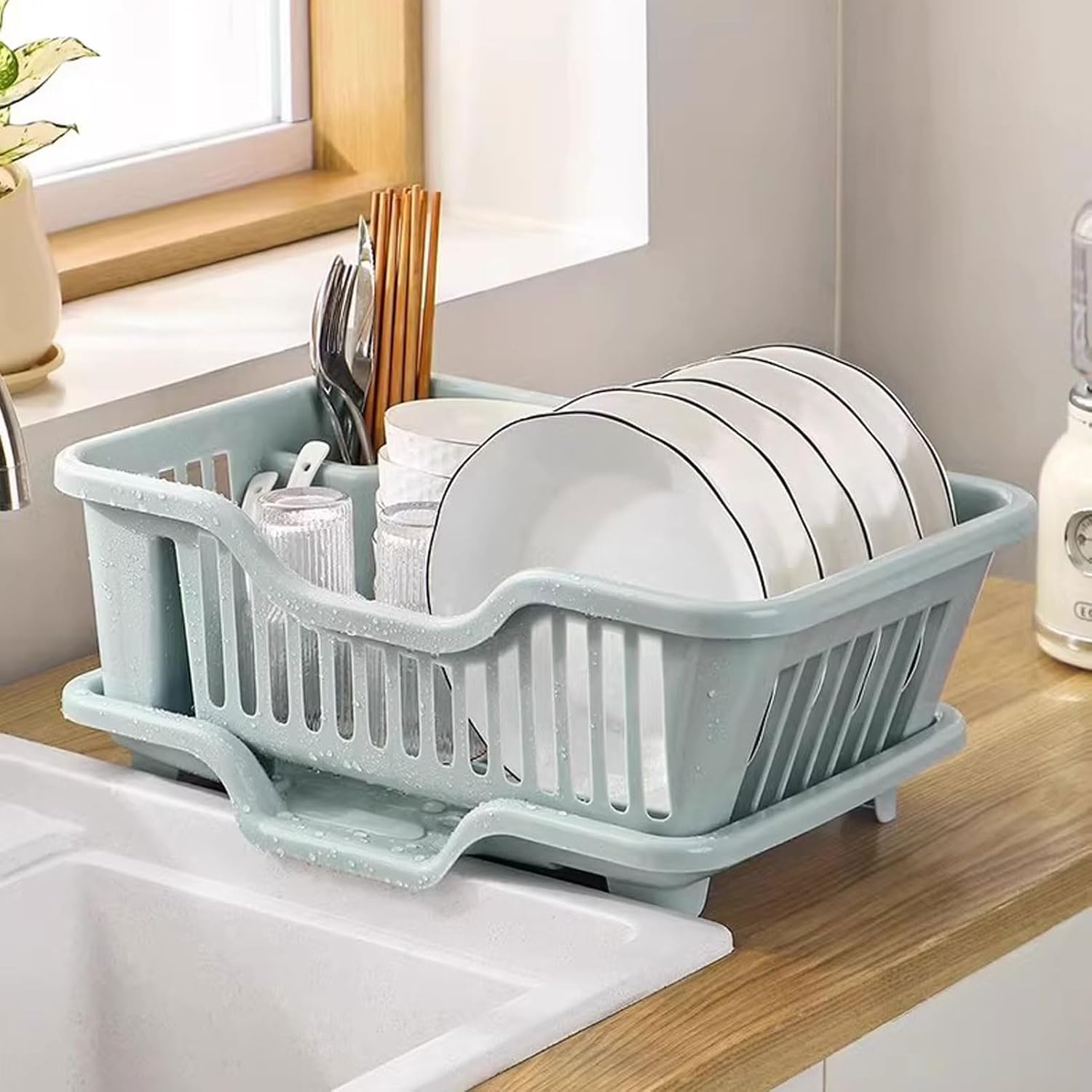 Simplify your kitchen cleanup with this compact plastic dish drying rack. Designed to hold bowls, plates, and utensils, it helps organize your dishwashing area while allowing water to drain efficiently. Made of PP material, it's lightweight and easy to clean. The integrated utensil holder keeps chopsticks, spoons, and forks upright and separated. Ideal for use beside the sink, on a countertop, or even in small kitchen spaces. The open slotted base allows water to drain into a tray or directly into the sink, helping reduce moisture buildup. A practical and space-conscious option for everyday dish drying. Specifications: Product Name: Dish Drying Rack Material: PP (polypropylene) Color: White / Blue / Light green / Dark green / Brown Design: Open base with utensil holder and side handles Package Includes: 1 x Plastic Dish Drying Rack Usage Notes: Recommended for light to medium loads of dishes and utensils. Please allow slight differences in measurements due to manual sizing. Rinse and dry regularly to maintain appearance.
