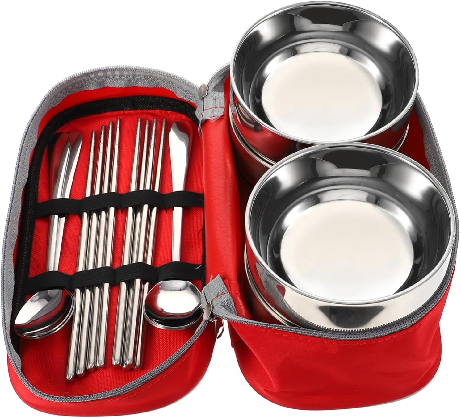 Package List 4 x bowls 4 x pairs of chopsticks 4 x soup ladles 1 x storage bag Characteristics - Material: Stainless steel, Oxford cloth Kitchen Tableware. - Chopstick Size: About 23cm/ 9.05 inch (length) Stainless Steel Bowl. - Spoon Size: About 18cm/ 7.08 inch (length) Stainless Steel Tableware. - Bowl Size: About 6x6.5x12cm/ 2.36x2.55x4.72inch Food Serving Bowls. - Storage Bag Size: About 25x12.5x10.5cm/ 9.84x4.92x4.13 inch Portable Cutlery. - This reusable utensils with storage bag allows you to enjoy every meal wherever indoor or outdoor during your trip Picnic Cutlery. - The size for you, so that it always fits all the snacks and foods you like Stainless Steel Bowls. - for cold or hot meals. size for soups, salads, noodles, grains, pastas, fruits, etc Reusable Cutlery. - Our modern dinnerware cutlery set is small in size and light in weight, making it easy to carry around Stainless Steel Chopsticks. - Made of stainless steel, and no odor, you can use them with confidence Portable Travel Cutlery.Goods InformationStainless Steel Cutlery You can eat instant noodle, salad, rice, soup and more.Stainless Steel Chopsticks This product is a set of bowl, spoon, chopsticks set, made of and material.Stainless Steel Bowls Suitable for indoor and outdoor use.Kitchen Tableware Lightweight and portable for easy to carry and store
