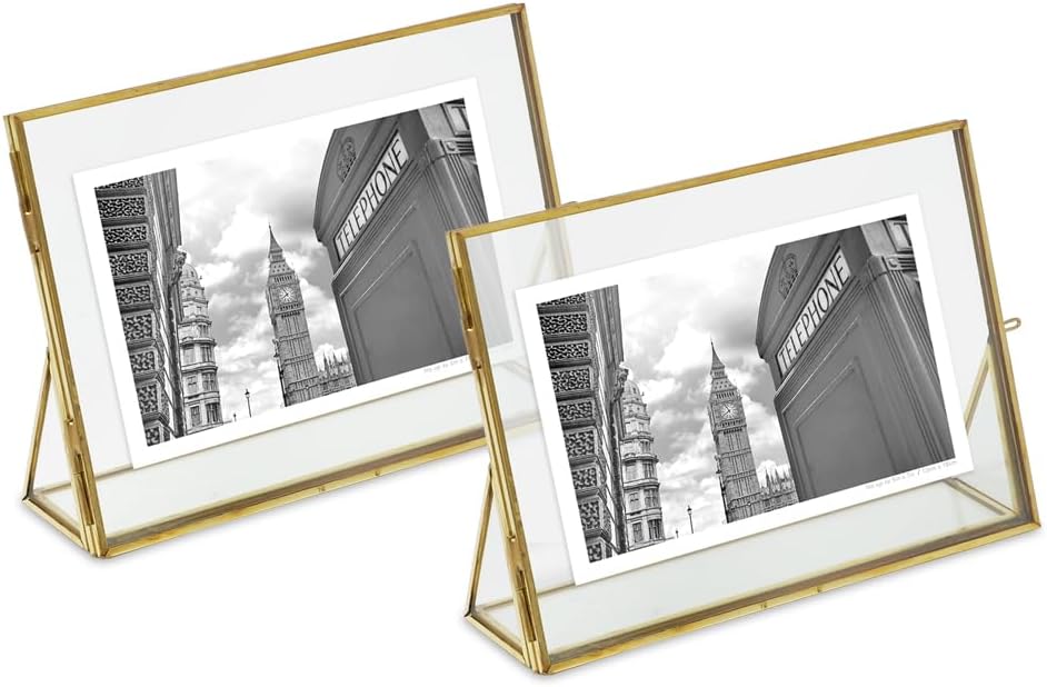 This Isaac Jacobs Vintage Style Brass & Glass metal frame, with a retro inspired locket closure combines the traditional look of 20th Century antique frames with the modern design of contemporary frames. There’s something special in the timeless appeal of these frames that capture your family photos and portrait shots and puts them charmingly on display. Whether you fill the frames with beautiful landscape shots or everyday moments of joy, your favorite photographs may look like works of art. There is a simple, clean, yet classy look to this pressed glass frame. Featuring trim, metallic edges, and a matching angled base, this frame is a sophisticated addition to any desk, shelf, cabinet, or mantlepiece in the home. All eyes will be drawn to the photos you choose to “float” inside the glass panes. To create the “floating” effect, insert a photo that is smaller, and secure with a tiny piece of tape. The classic design and simple functionality of the locket closure completes this modern metallic frame’s vintage charm. Gently slide up the bar to raise the clasp and insert a photo. Slide down to securely close. Pressed flowers will become a gorgeous decorative accessory inside the glass panes of this frame. Breathe new life into old hand-written notes or put your kids’ artistic side on display by framing their drawings. This elegant frame makes a perfect display choice for hotel and restaurant counterspace and a wonderful way to celebrate special events, like weddings, birthdays, graduations and baby-naming ceremonies. Tell the story of love inside these beautiful frames that make delightful centerpiece and table number display options. We spend so much time flipping through images on screens all day, it feels good to see our memories and passions preserved in style. {NOTE: THIS FRAME DOES NOT STAND HORIZONTALLY AND CANNOT BE MOUNTED ON A WALL!}